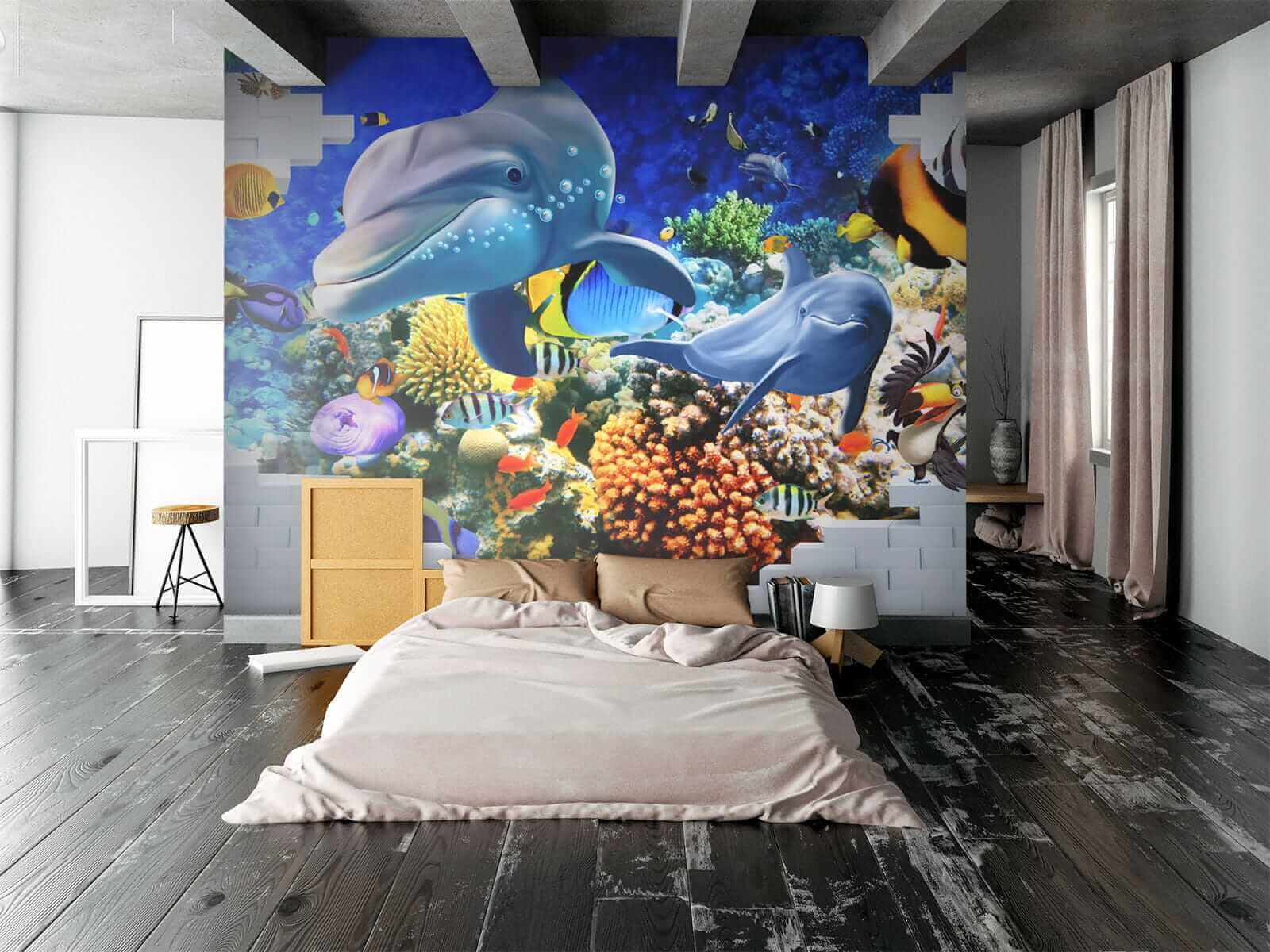 Dive into a vibrant underwater world with this mural of fish and playful dolphins, bringing a splash of the sea right into your home. Imagine stepping into your room and feeling the soothing ocean vibes wash over you. Bright colors dance around—from cheeky clownfish to sleek dolphins showcasing their best smiles. It’s more than just decor; it’s like having a slice of the deep blue at your fingertips. Perfect for a kid’s room, a cozy den, or anywhere that could use a cheerful spark. Honestly, who wouldn’t want a dolphin as a roommate? Let this mural be your daily reminder of the ocean’s wonder, minus the wetsuit!