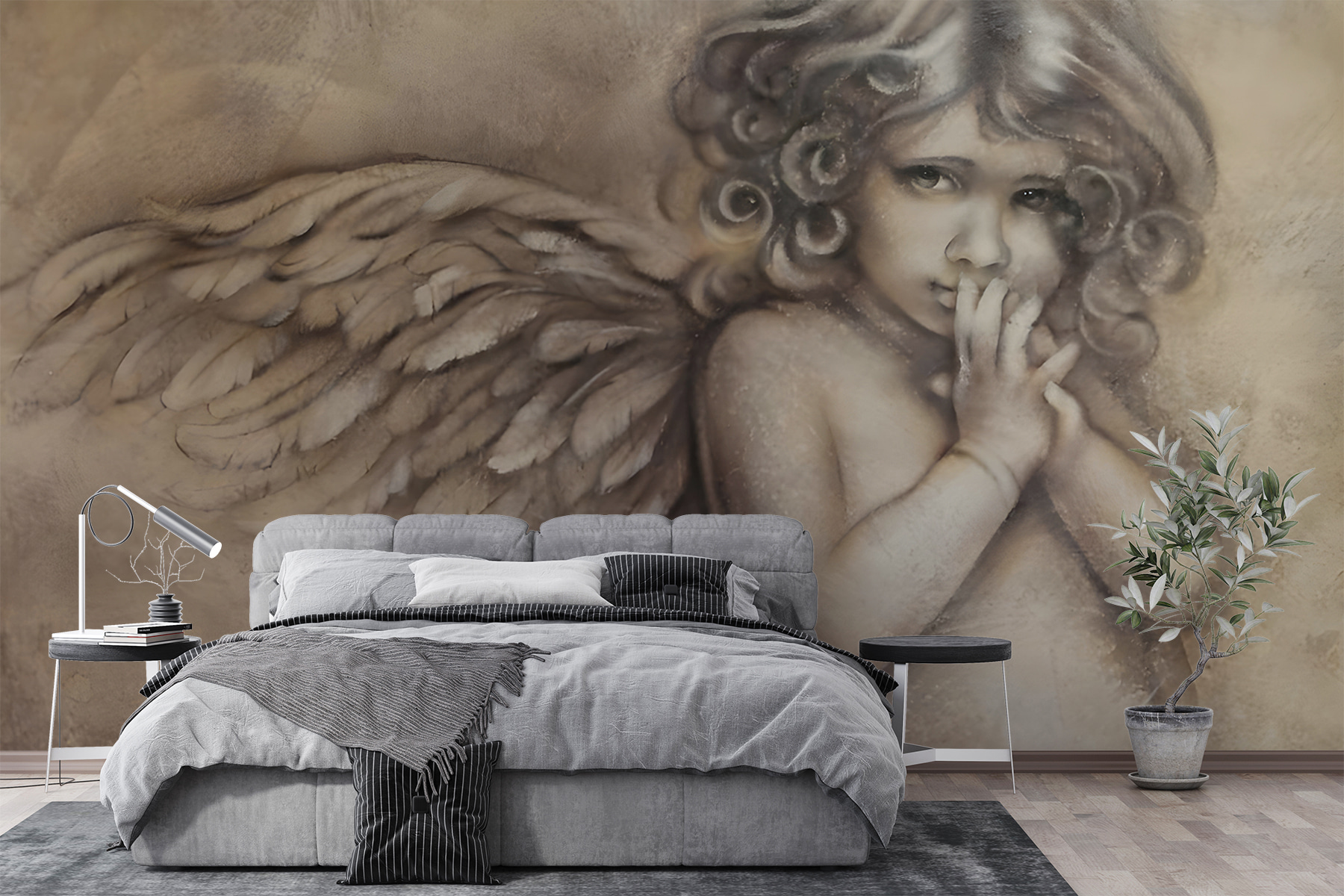 ¿Alguna vez ha querido un toque de fantasía en sus paredes? Te presentamos el mural “Ángel pensativo con alas suaves”. Es como el suave suspiro de una tarde de brisa, capturado en arte. Este ángel, pensando en cosas profundas con esas preciosas y delicadas alas, invitará a la calidez y la armonía en cualquier habitación.