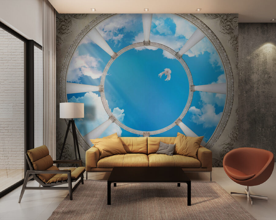 Imagínese entrar en una habitación donde un cielo impresionante se encuentra con elegantes columnas, todo ello mientras un pájaro vuela por encima. Este mural, con su efecto 3D, transforma instantáneamente cualquier espacio en una escapada de ensueño. Es como tener un trozo de naturaleza en el salón de casa. Sus amigos podrían detenerse a mitad de una conversación, mirando hacia arriba, preguntándose si se han colado en un gran salón o en un cielo sereno.