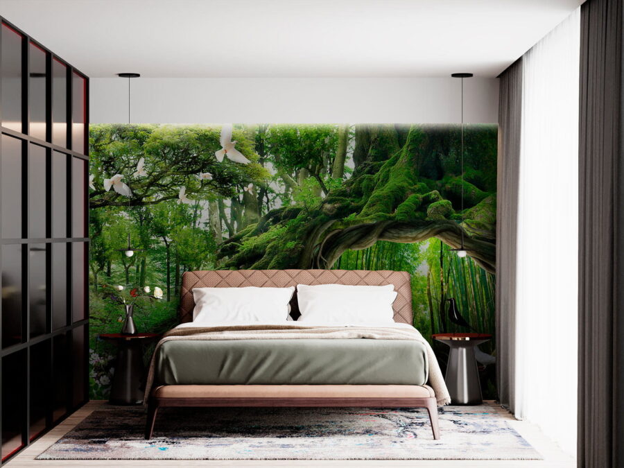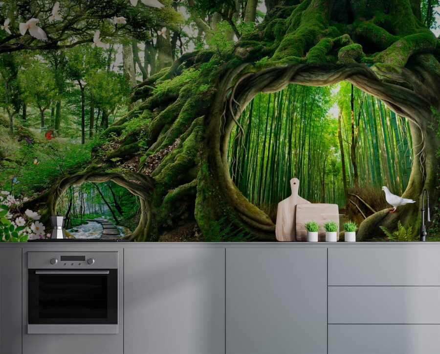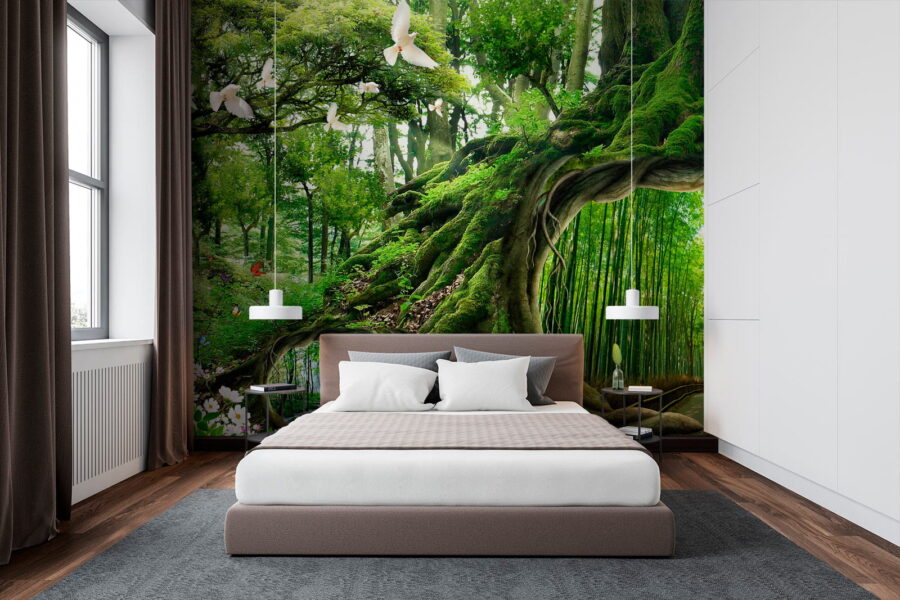 Transforma tu espacio en un acogedor refugio en el bosque con el «Mural de pared Árbol con un agujero en el centro». Imagina entrar en tu habitación y sentir que acabas de adentrarte en un bosque mágico. Este mural captura la esencia de la naturaleza, con verdes vibrantes y pequeños detalles caprichosos, como mariposas y palomas. El árbol, con su acogedor hueco, juega con la mente: ¡es como una puerta a otro mundo encantador! Perfecto para soñadores o cualquiera que necesite un poco de terapia natural. Piensa en él como un recordatorio diario para respirar y relajarte, trayendo el exterior al interior mientras sigues disfrutando de las comodidades del hogar. Es un papel pintado que susurra historias de aventura y tranquilidad, haciendo que cada mirada sea una pequeña escapada. ¿Cómo podría alguien resistirse?