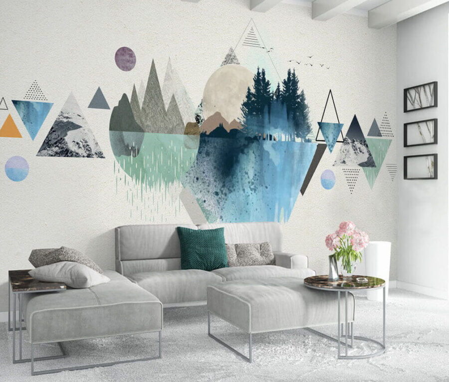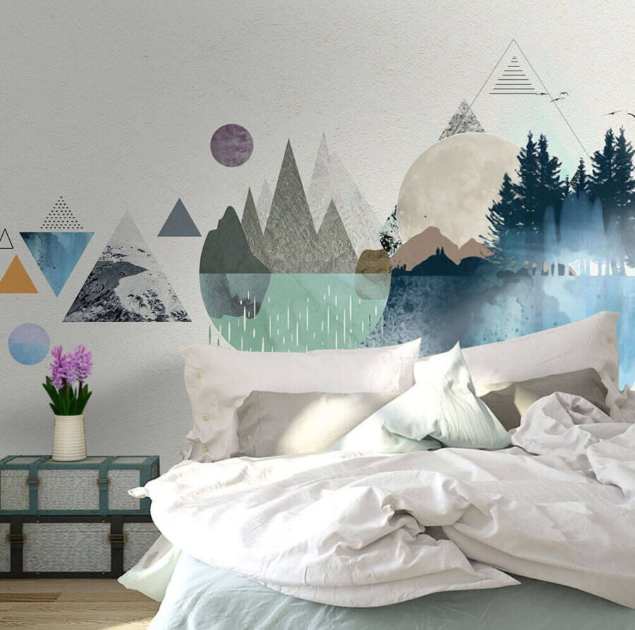 Transforma cualquier estancia en un remanso de paz con el mural «Agua y árboles en un paisaje». Imagínate entrar en un espacio que te transporta a un tranquilo refugio en el bosque, ¡sin insectos, por supuesto! Este impresionante diseño combina suaves acuarelas y formas geométricas, creando un fondo tan relajante como el murmullo de un arroyo.