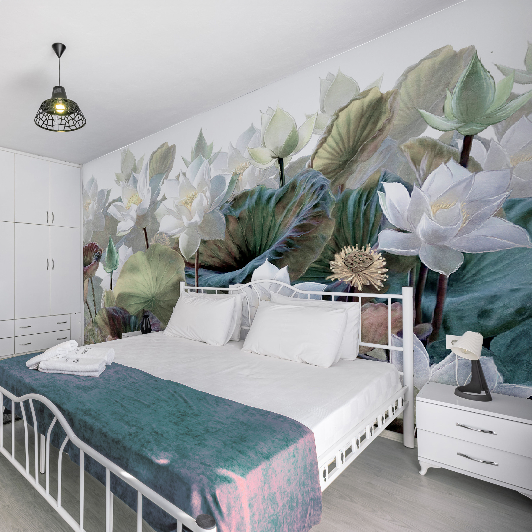 Imagínese despertarse cada mañana con un sereno estanque de lotos en el salón de su casa. Este mural “Flores de loto entre exuberantes hojas verdes” es más que una simple pieza de arte mural: es como entrar en un tranquilo oasis ajardinado. Los blancos suaves y los verdes intensos combinan a la perfección, creando un ambiente relajante que es a la vez elegante y refrescante. Imagínatelo: mañanas acogedoras con té o relajándote después de un largo día, rodeado de la belleza de la naturaleza… ¡sin los molestos bichos, por supuesto! Tanto si eres un amante incondicional de la naturaleza como si sólo quieres un toque de tranquilidad, este mural te dará la sensación que buscas. Perfecto para añadir ese factor sorpresa instantáneo a cualquier espacio.