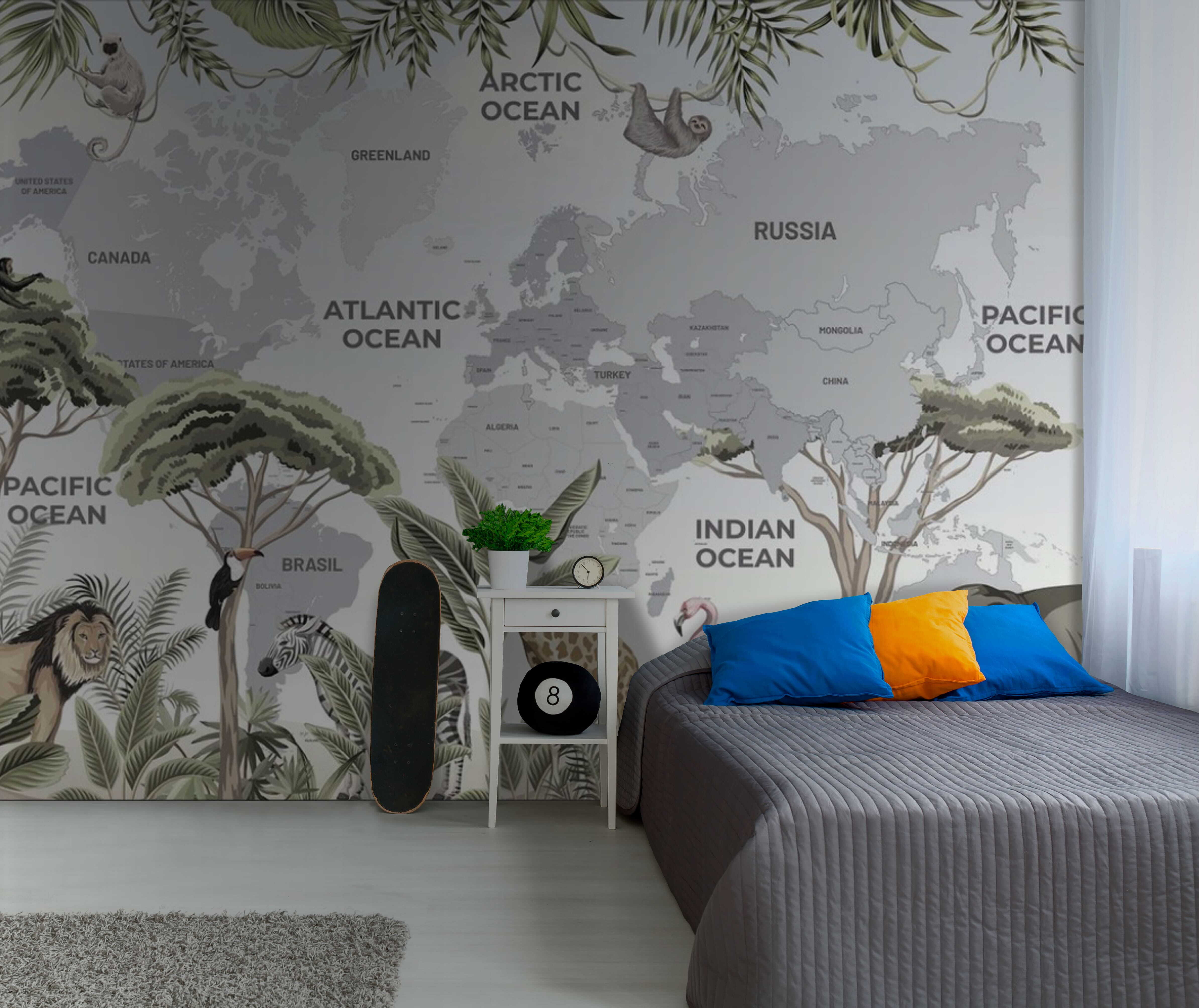 Imagina llevar un trozo de naturaleza salvaje a tu espacio con este encantador mural. “Jirafa de pie junto a un árbol” combina a la perfección animales encantadores con un fondo de mapamundi. Es como un mini safari, sin el desfase horario. Imagina a los más pequeños admirando la jirafa, divisando el flamenco, adivinando los continentes… todo ello mientras aprenden geografía de la forma más fabulosa. Cada vez que pases por delante, no podrás evitar sonreír ante el juguetón perezoso que anda por allí. No es sólo un mural, es un tema de conversación, un desencadenante de ensoñaciones, ¡un trocito de aventura! Perfecto para las habitaciones de los niños, está lleno de detalles encantadores que harán crecer su curiosidad por el mundo.