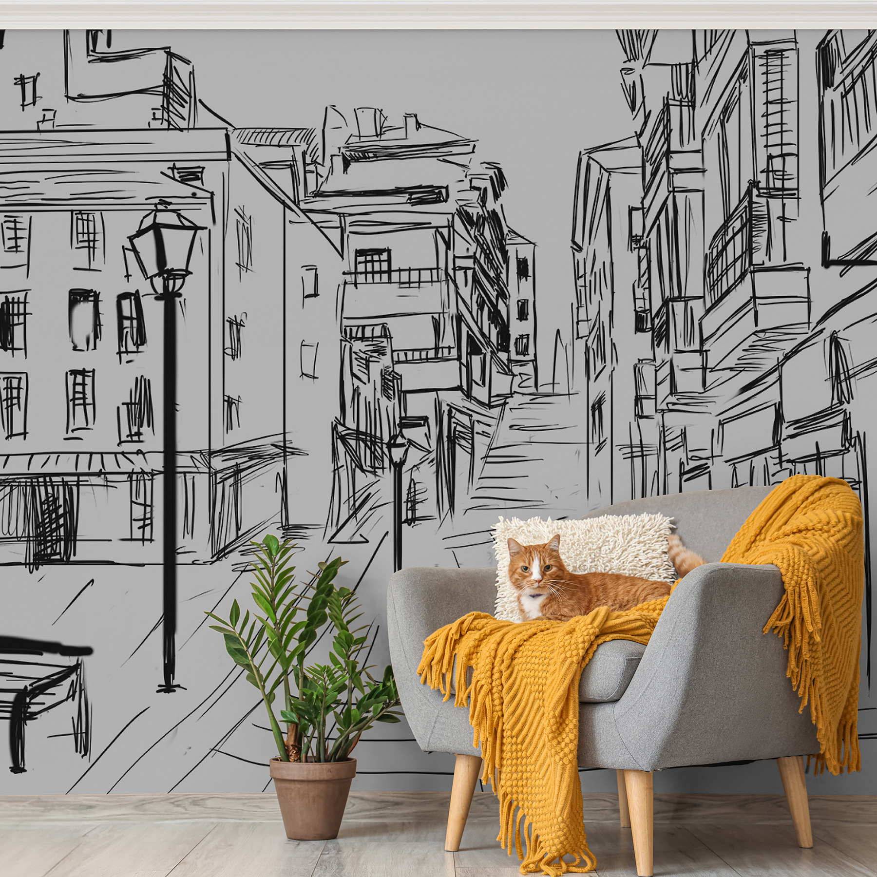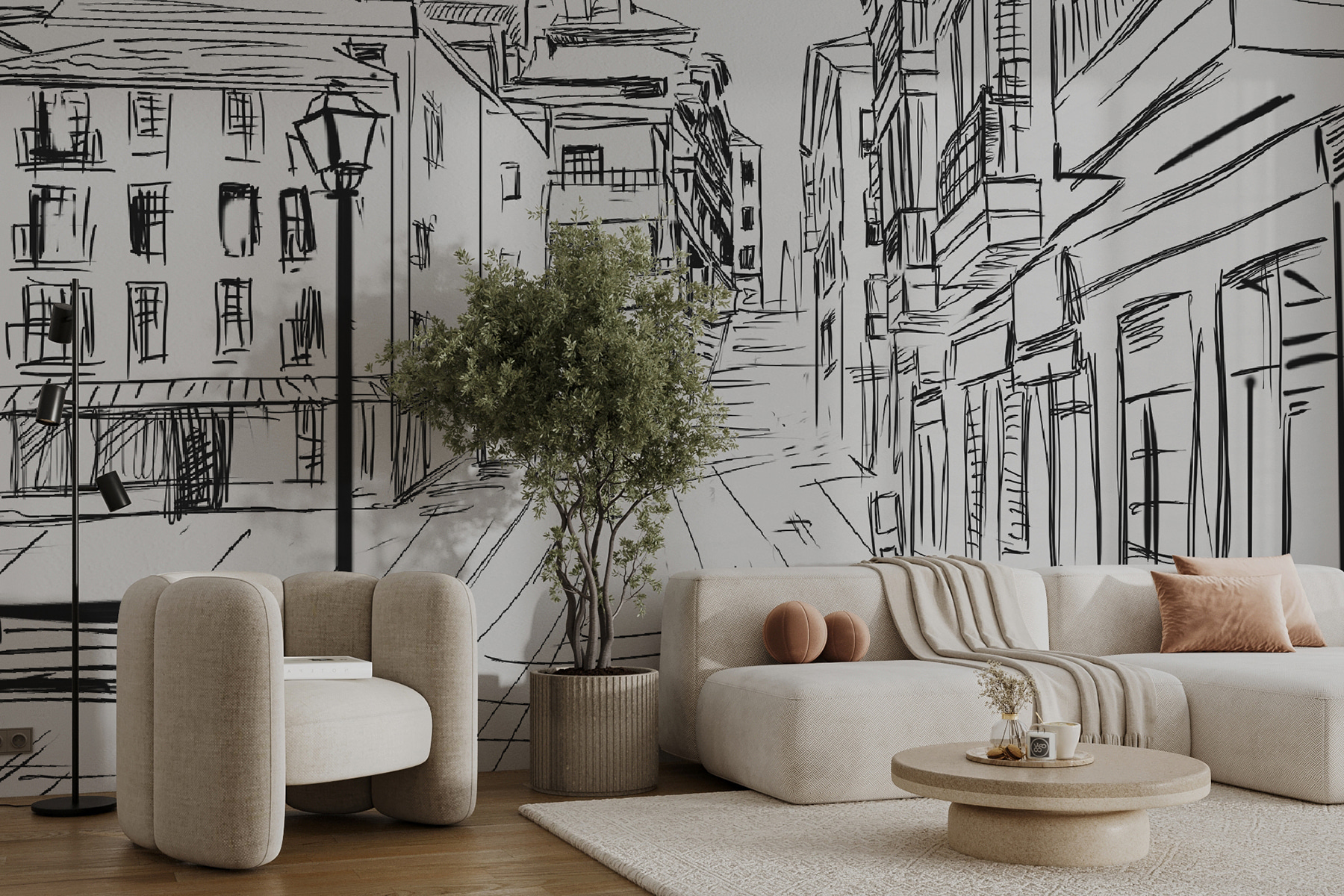 Imagínese descansando en su salón con este impresionante mural en blanco y negro en la pared. Es como un dibujo caprichoso que cobra vida. Las juguetonas líneas que capturan una escena urbana -completa con un banco solitario y edificios imponentes- aportan un toque artístico que te hará soñar con las calles europeas.