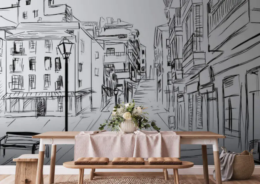 Imagínese descansando en su salón con este impresionante mural en blanco y negro en la pared. Es como un dibujo caprichoso que cobra vida. Las juguetonas líneas que capturan una escena urbana -completa con un banco solitario y edificios imponentes- aportan un toque artístico que te hará soñar con las calles europeas.