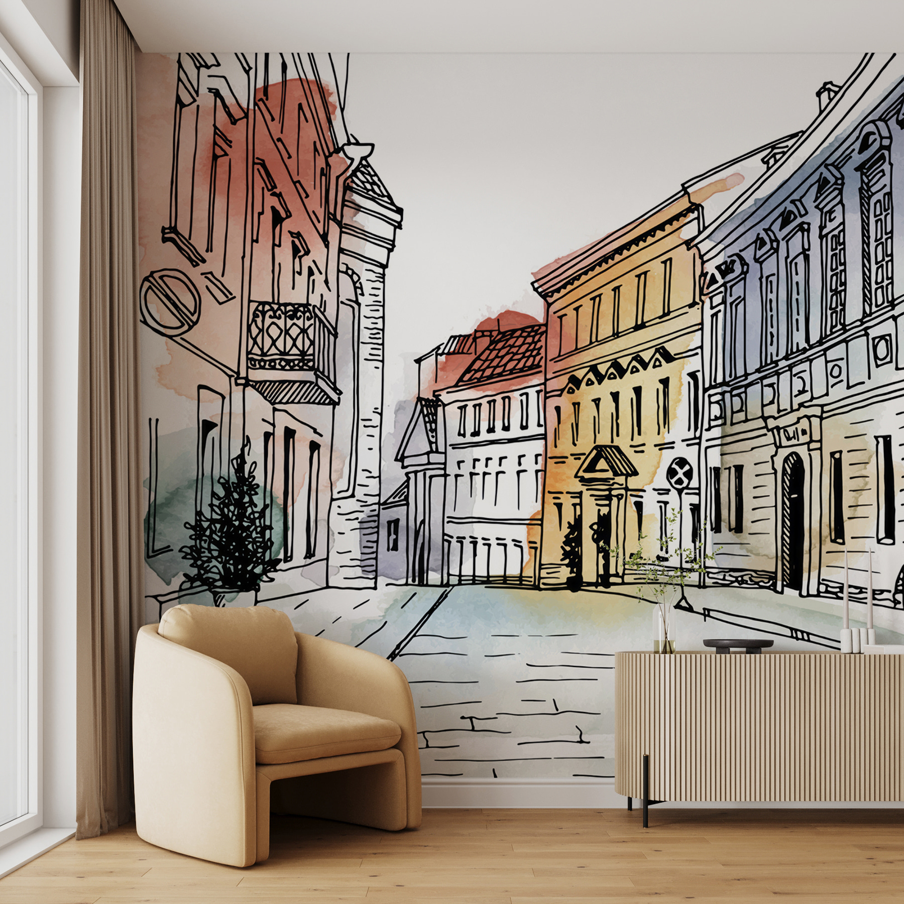 Imagínese esto: entra en su salón y, ¡zas!, se ve transportado al instante a una encantadora calle europea. Este “Mural de pared Dibujo de un edificio” aporta un toque de arquitectura y elegancia del viejo mundo directamente a sus paredes. Hecho para los amantes de los bellos diseños y los espacios únicos, este mural le invita a pasear por esas calles adoquinadas cada vez que echa un vistazo. ¿Necesita un tema de conversación? Aquí lo tiene. Sus invitados podrían perderse en las intrincadas líneas y suaves salpicaduras de acuarela. Perfecto para dar a cualquier habitación un ambiente acogedor y sofisticado. Es como tener unas minivacaciones en casa, sin el desfase horario. Mucho mejor que la pintura normal, ¿no crees?