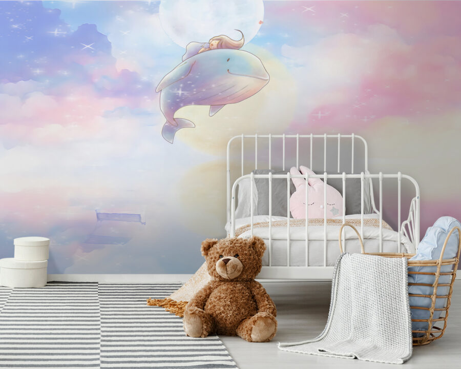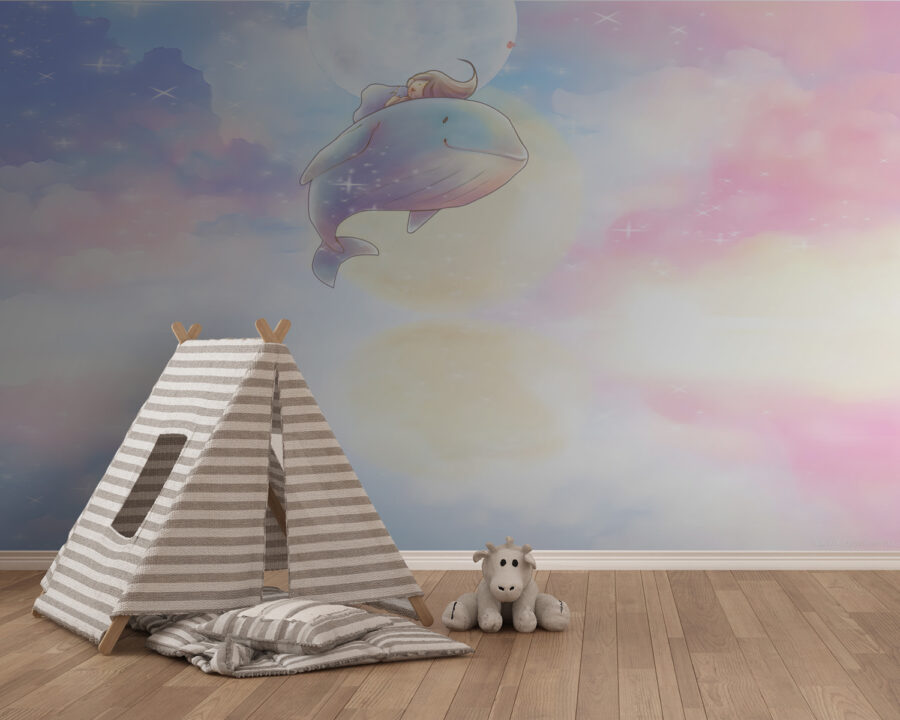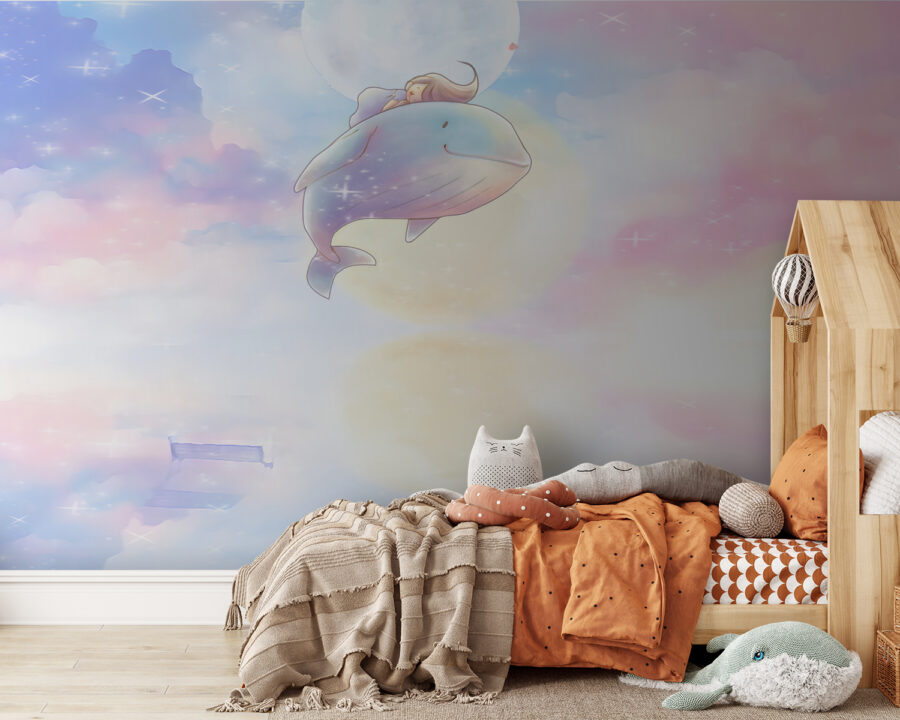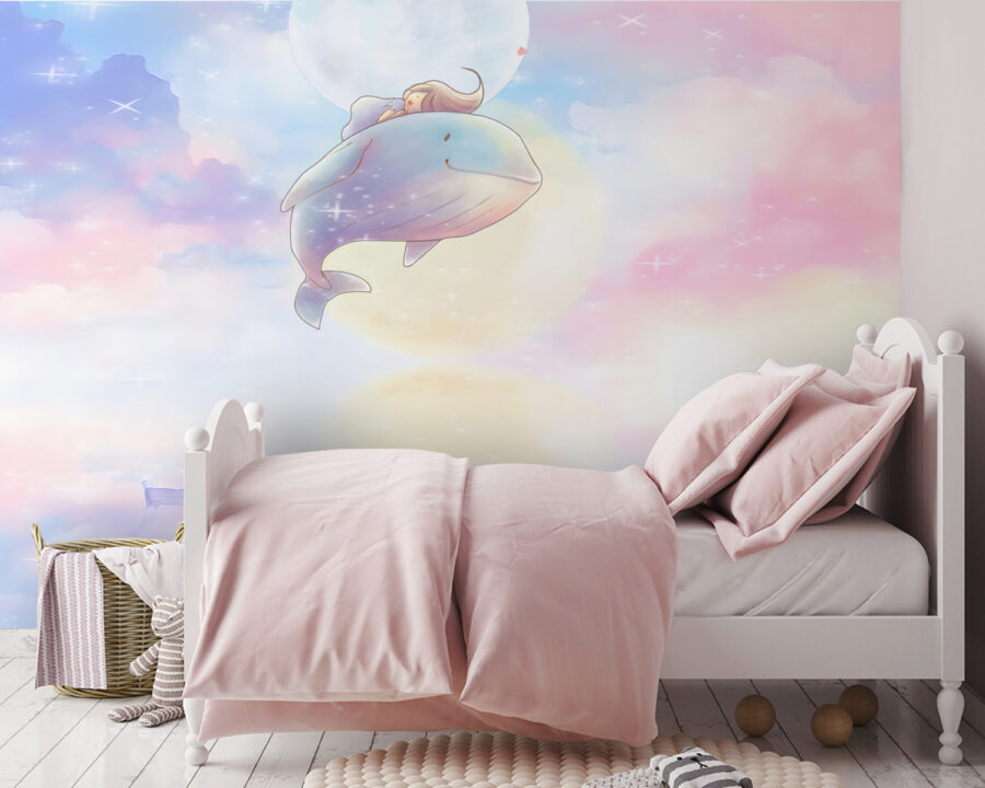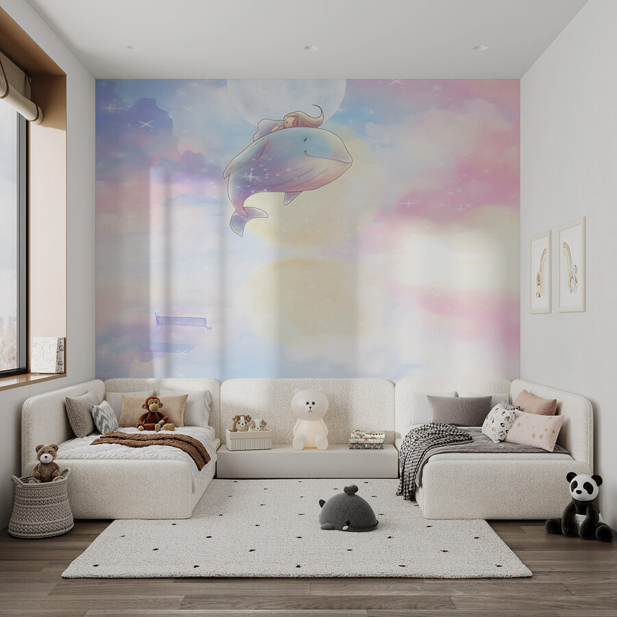 Te presentamos a tu nuevo mejor amigo: ¡el mural “Dibujos animados de una ballena”! Esta escena de ensueño es como un dulce viaje a un mundo mágico, en el que una simpática ballena acompaña a tu hija a través de esponjosas nubes de colores pastel. Perfecto para la habitación de su hija o para cualquier espacio creativo.