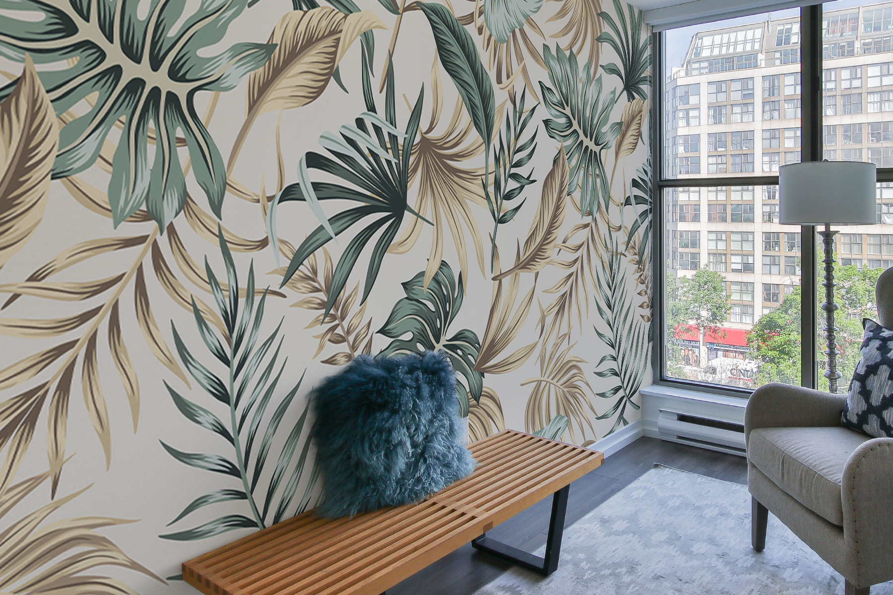 Transforme su espacio con este precioso mural de hojas tropicales sobre un relajante fondo beige. Imagina que entras en tu habitación y te sientes como si estuvieras en un sereno refugio en la selva. Esos verdes exuberantes resaltan contra el lienzo suave, creando una vibra que es a la vez calmante y energizante. Perfecto para salones, dormitorios o incluso para un acogedor rincón de lectura, invita a respirar aire fresco. Tus amigos se preguntarán si has contratado a un decorador, pero en realidad eres tú y tu buen gusto haciendo de cada rincón un pequeño paraíso. ¿A qué esperas? ¡Sumérgete en el follaje!