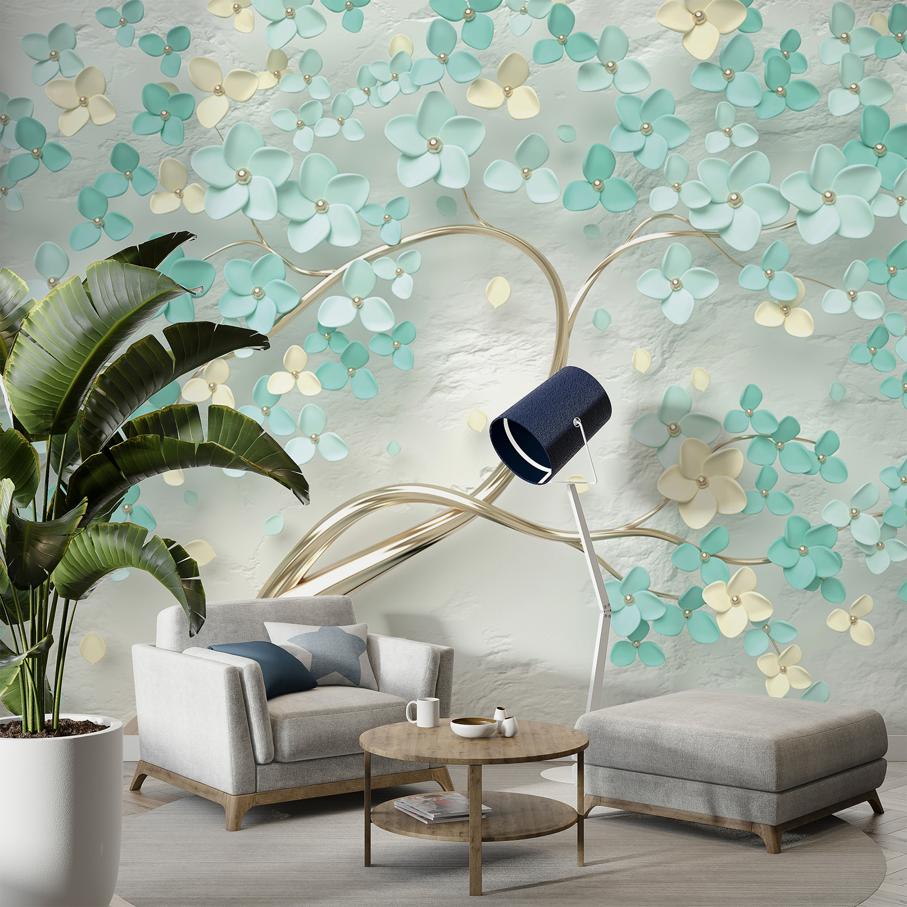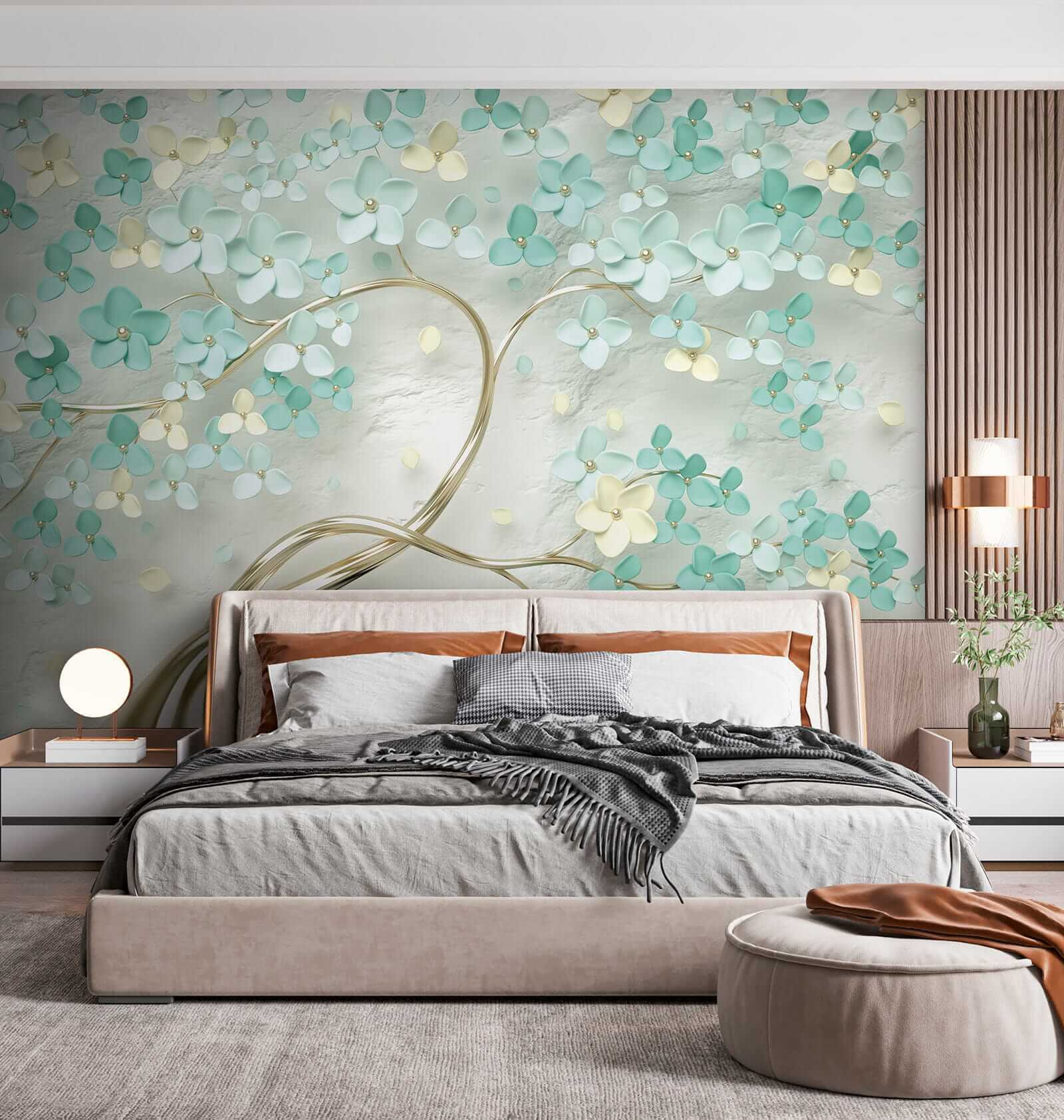 Transforme cualquier habitación con este impresionante mural de pared, donde delicadas flores danzan sobre un suave telón de fondo. Imagínese entrando en un jardín iluminado por el sol, donde los relajantes colores turquesa y crema le abrazan suavemente. Es como llevar un soplo de primavera al interior, ¡sin necesidad de riego! Este mural no sólo añade encanto, sino que también crea una atmósfera serena que susurra relajación. Imagínese tomando el café de la mañana frente a él, sintiendo cómo le invade la calma o creando un espacio acogedor para la lectura nocturna. Así que, ¿por qué no dejar que sus paredes florezcan?