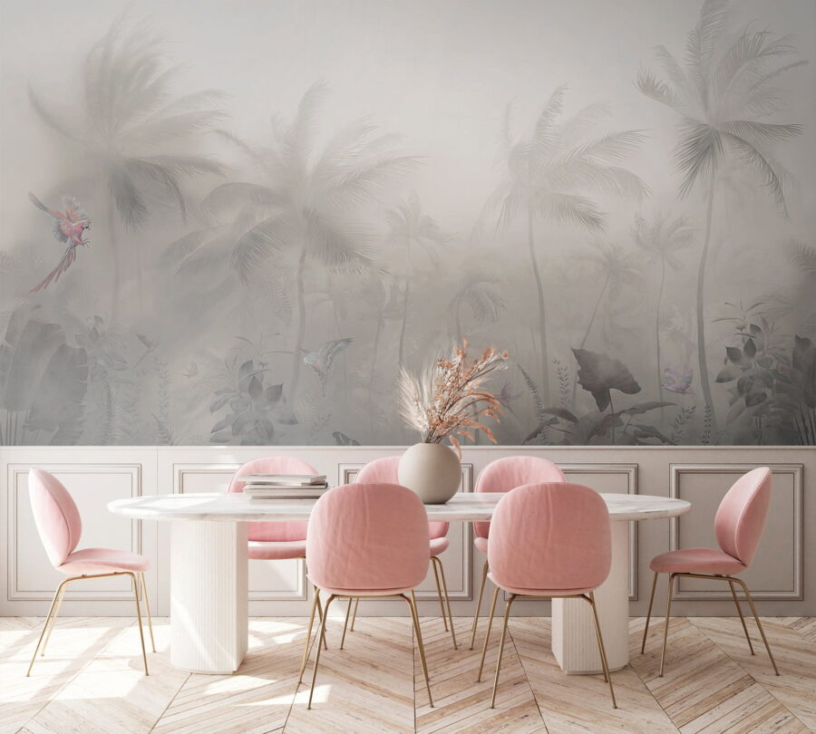 Transforma cualquier espacio en un refugio de ensueño con este encantador mural: «Bosque brumoso con palmeras y mariposas». Es como adentrarse en un tranquilo refugio tropical cada vez que pasas por delante. Esas delicadas criaturas que revolotean añaden un toque de fantasía, haciéndote sentir como si estuvieras en un cuento de hadas. Los suaves tonos brumosos crean un ambiente tranquilo, perfecto para soñar despierto o charlar tranquilamente mientras tomas un café. Imagínatelo detrás de un sillón mullido, convirtiendo tu rincón de lectura en un oasis personal. ¿Quién no se sentiría relajado aquí? Este mural es tu pasaporte a ese ambiente isleño relajado sin necesidad de protector solar.