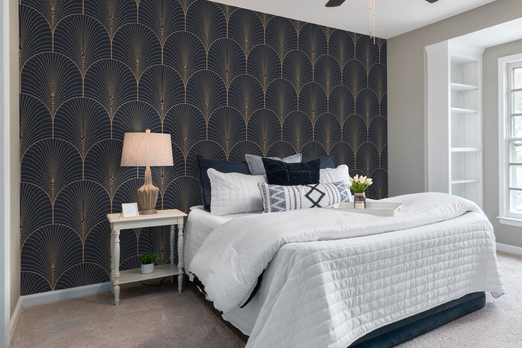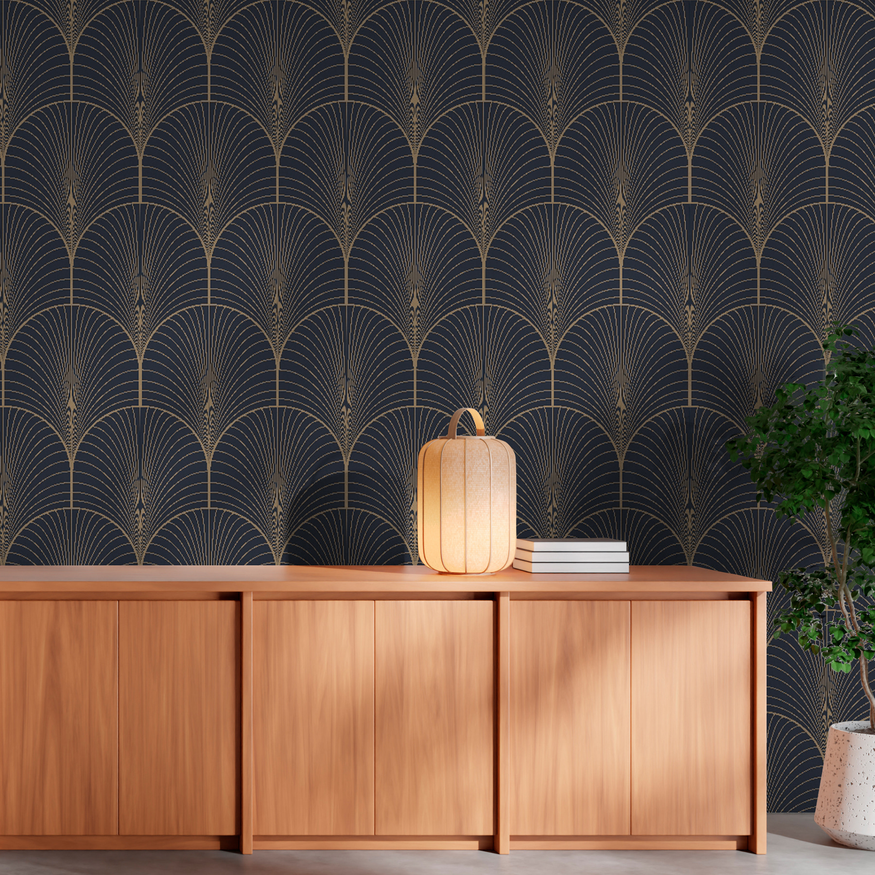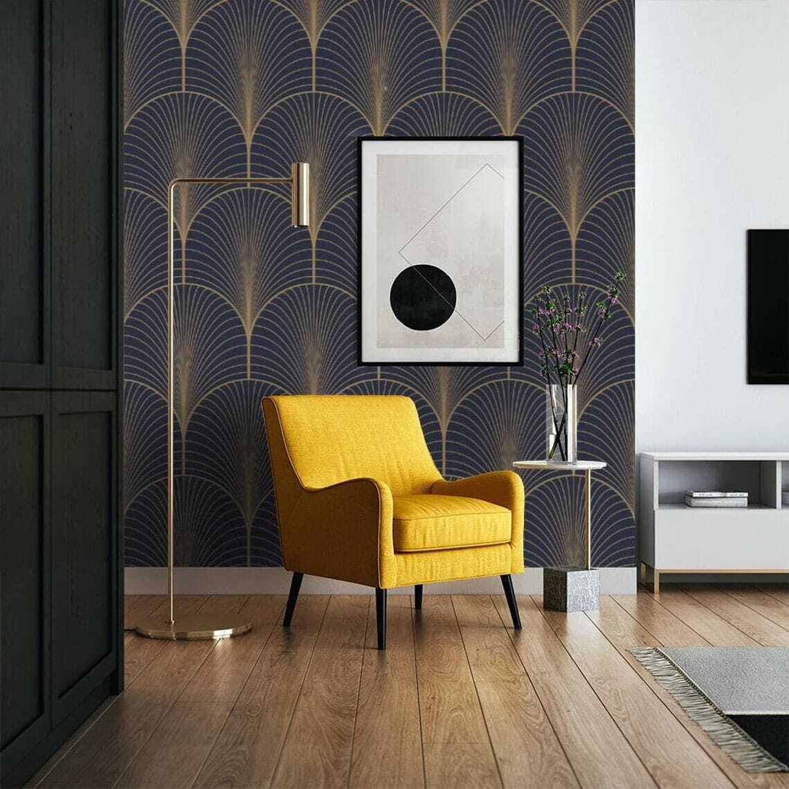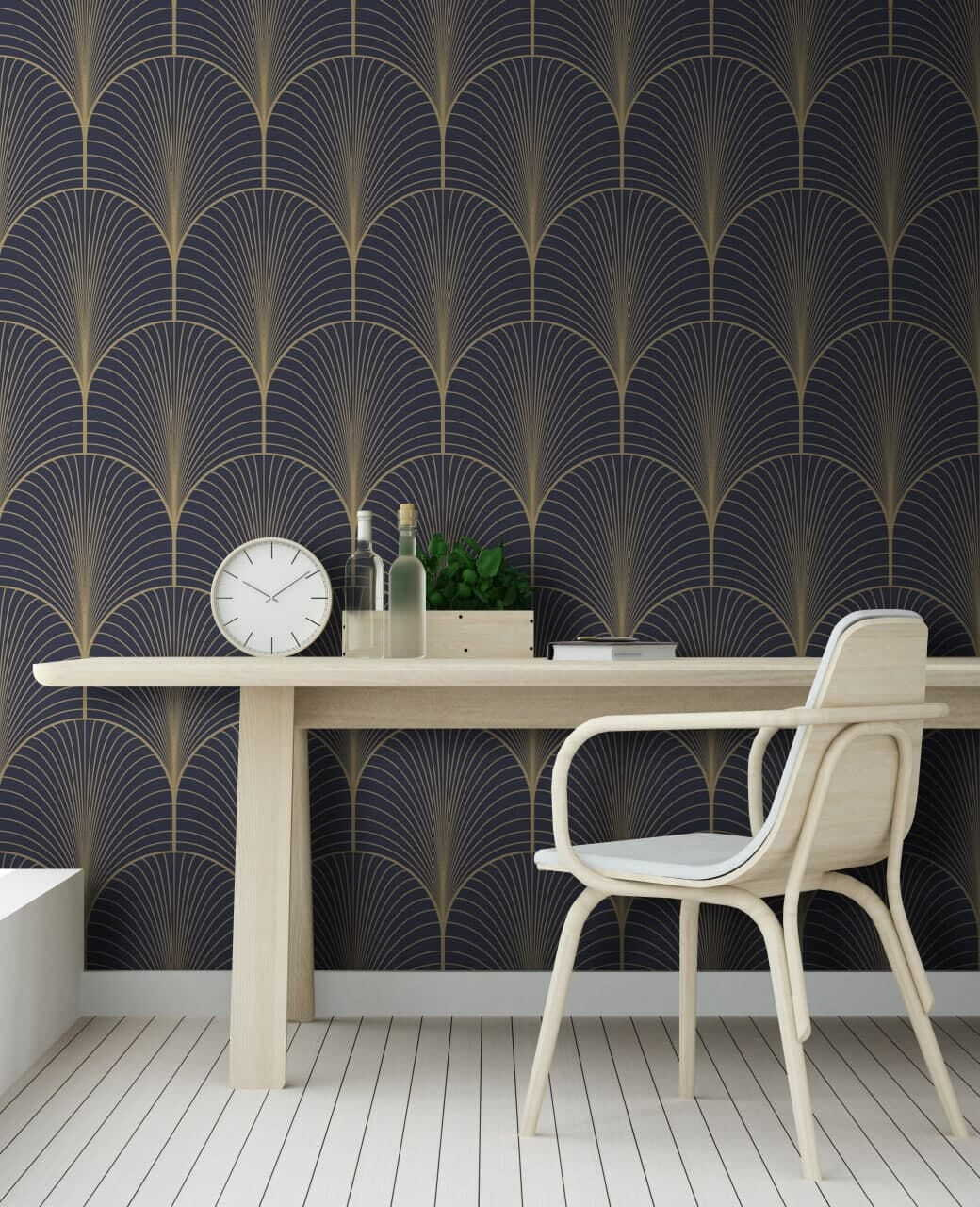 Transforme su espacio con la elegancia de este mural de abanico art decó. Imagínese esto: entrar en una habitación donde sus paredes están adornadas con elegantes curvas y líneas, dando un ambiente sofisticado instantáneo. Es como tener una pieza de arte atemporal que aporta un toque moderno. Casi puedes oír el jazz sonar suavemente mientras te tomas un café, sintiéndote inspirado y animado. Ya sea en un acogedor rincón de lectura o en una moderna sala de estar, este mural añade carácter sin ser abrumador. Es perfecto para iniciar una conversación: ¡espera a que lleguen tus amigos y no puedan evitar admirar el estilo que has creado!