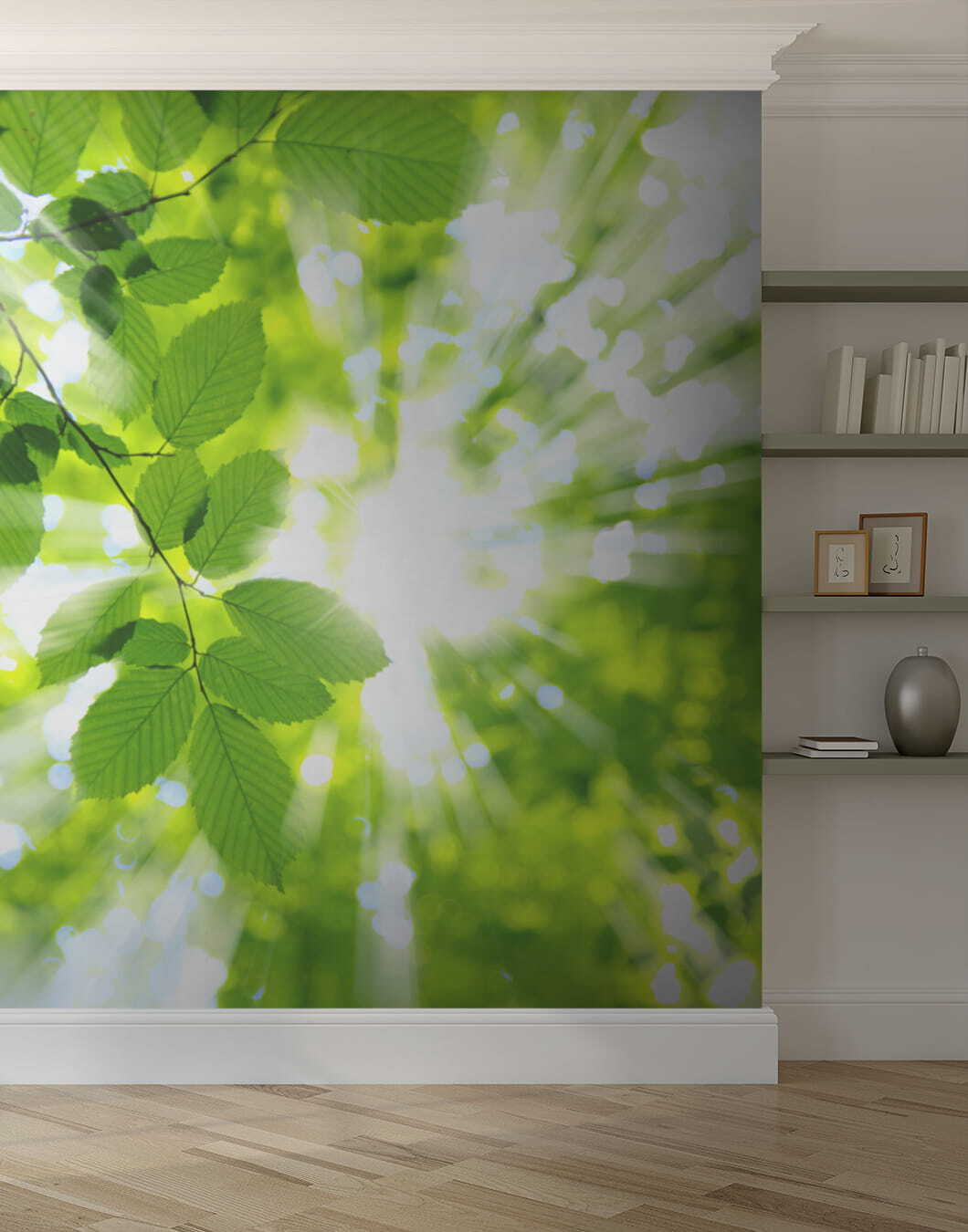La forma en que la luz se filtra a través de esas hojas es pura magia, casi como si pudieras sentir el calor en la cara. Es insuperablemente sereno, como si la naturaleza te diera un abrazo cada vez que entras en la habitación. Ideal para un dormitorio, una oficina en casa o ese rincón de lectura que no dejas de prometer que utilizarás más. Este mural no es sólo decoración; es un pedacito de tranquilidad justo en tu pared. Pongámonos de acuerdo: ¿quién no necesita más de eso?