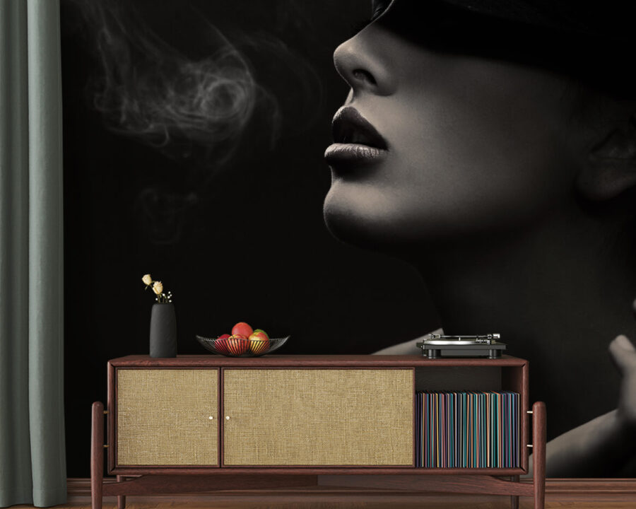 Transforme su espacio en un refugio artístico con este cautivador mural de una mujer con sombrero, fumando despreocupadamente. Es como entrar en un elegante café donde cada rincón susurra elegancia e intriga. La forma en que mira a lo lejos, rodeada de un remolino de humo, añade un toque de misterio, perfecto para suscitar conversaciones interesantes.