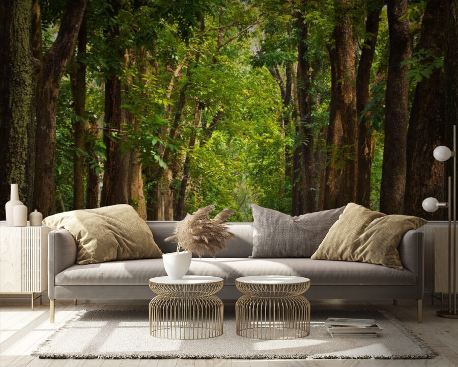 Transforma tu espacio con este cautivador mural que representa un tranquilo sendero bordeado de majestuosos árboles. Imagina pasear cada día por este tranquilo sendero sin salir de casa: cada vez que mires el mural, sentirás una sensación de calma y conexión con la naturaleza. La luz del sol se filtra a través de las hojas, creando una atmósfera cálida y acogedora que despierta la curiosidad incluso del gato más gruñón. Ya sea en el salón o en un rincón de lectura acogedor, este mural susurra historias de paseos tranquilos y tardes de ocio. Además, los tonos tierra añaden el toque justo de elegancia. ¿Quién necesita una escapada al aire libre cuando puede tener esta encantadora vista en su pared?