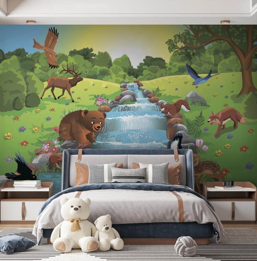 Transforma tu espacio en un bosque lleno de vida con este encantador mural decorativo en el que aparecen unos simpáticos animales disfrutando de un día soleado junto a un arroyo cristalino. Imagina a un oso chapoteando en el agua, un ciervo curioso agachándose para beber y una traviesa ardilla tramando su próximo bocado. Este mural aporta una sensación de alegría y calidez, perfecta para salas de estar o zonas de juego: ¡es como tener una pequeña aventura en la naturaleza en tu propia casa! Cada mirada te recordará tiempos más sencillos, aire fresco y tal vez incluso te dé ganas de salir al aire libre. ¡Déjate seducir por el encanto de la naturaleza y deja que tus paredes cuenten una historia!
