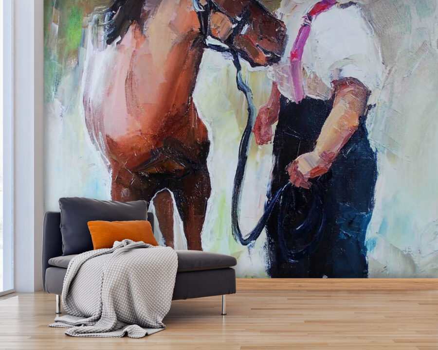 Presentamos un mural que captura la magia en estado puro: una niña compartiendo un tierno beso con su caballo. Esta obra de arte no es solo pintura sobre una pared, es una ventana a un mundo donde la inocencia y la amistad florecen entre suaves pinceladas. Imagínese entrar en este espacio y sentirse inmediatamente animado, como un cálido abrazo en un día frío. Los colores terrosos se mezclan armoniosamente, despertando una sensación de paz y nostalgia. Es perfecto para alegrar una sala de juegos, añadir encanto a un rincón acogedor o despertar la alegría en cualquier habitación. ¡Un delicioso recordatorio de que el amor no conoce límites, ni siquiera de especies! Tanto si eres un amante de los caballos como si simplemente aprecias la decoración única, este mural canta una dulce melodía que resuena en el corazón. ¿Quién no querría disfrutar de ese tipo de calidez todos los días?