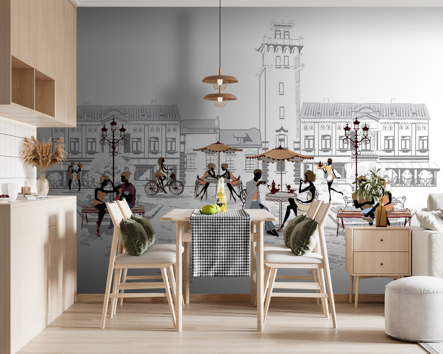 Imagínese esto: una encantadora escena callejera que trae un trocito de vida a su hogar. Este mural captura un día soleado en el que un hombre y una mujer se sientan en un acogedor banco, rodeados por el bullicio de una animada cafetería. Imagínese el tintineo de las tazas de café, las risas de los amigos y una suave brisa. Es perfecto para cualquiera que ame el ambiente de la vida urbana o simplemente quiera evadirse en un momento pintoresco. Esta pieza no sólo caldea una habitación, sino que también invita a compartir historias y recuerdos, suscitando conversaciones como las que tienen lugar en el mural. Sin duda, un tema de conversación.