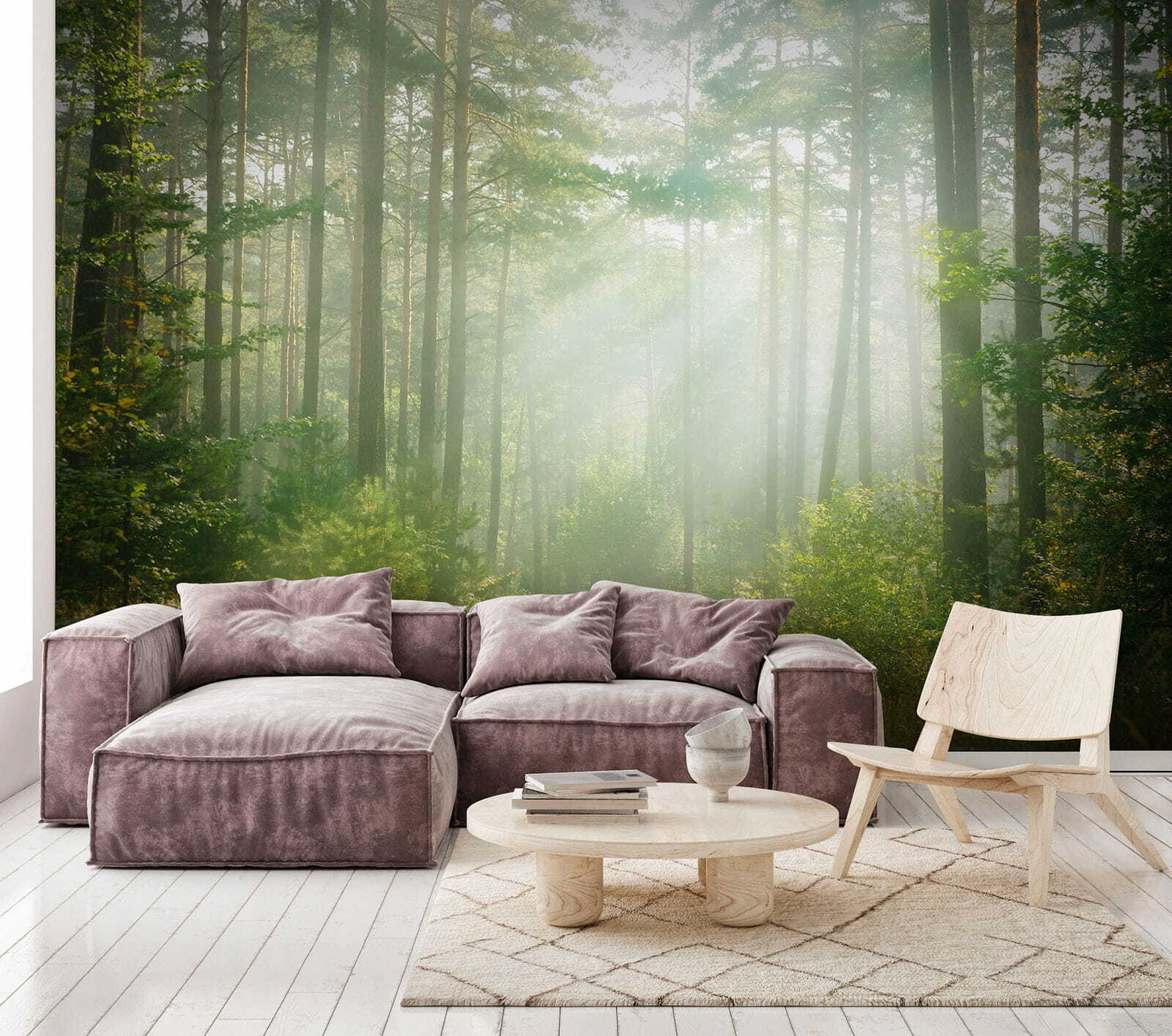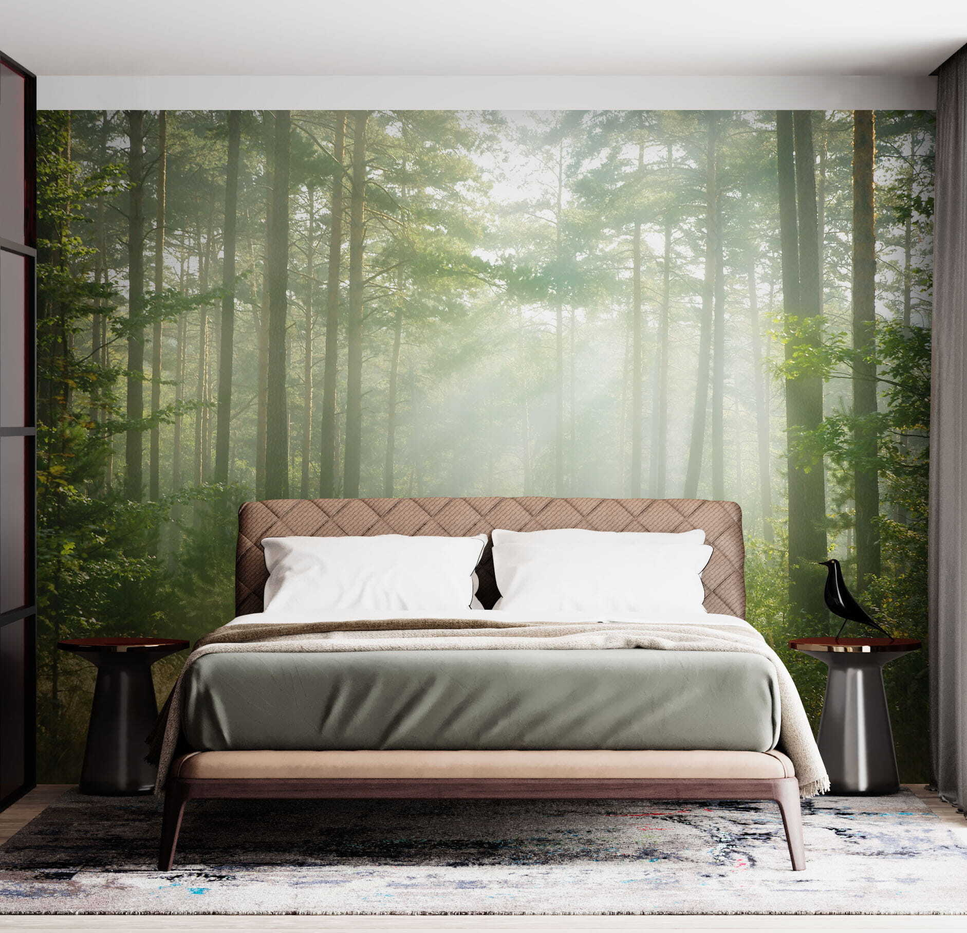 Transforma tu espacio en una serena escapada al bosque con este mural en el que la luz del sol se cuela entre los altos árboles del bosque. Imagina que entras en un bosque iluminado por el sol cada vez que entras en la habitación: un sueño, ¿verdad? El suave resplandor de la luz que se filtra a través de las hojas aporta calidez y calma, por lo que es perfecto para un acogedor rincón de lectura o una animada zona de estar. Es como un soplo de aire fresco sin los molestos insectos. Ya sea tomando el té o soñando despierto, este mural invita a momentos de paz e inspiración. Decora tus paredes y deja que la magia de la naturaleza entre en ellas.