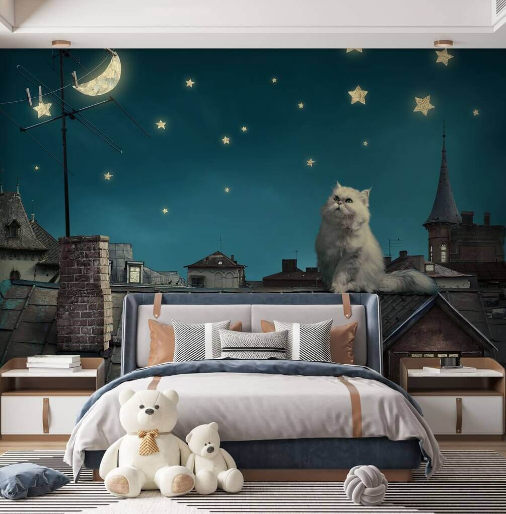 Este mural te hará soñar con noches en azoteas y cielos estrellados. “El gato contempla el cielo nocturno” parece sacado de un cuento para dormir. Imagina esta escena en el salón de tu casa o en la habitación de un niño, ¡tan mágica! La mirada soñadora del gato a las estrellas es puro encanto, una escapada pacífica del ajetreo y el bullicio. A los niños les encantará su ambiente juguetón; a los adultos, su estética tranquilizadora. Es una mezcla de encanto abstracto y asombro infantil, perfecta para despertar la imaginación. Además, ¿quién podría resistirse a ese adorable y esponjoso felino que mira con curiosidad la noche?