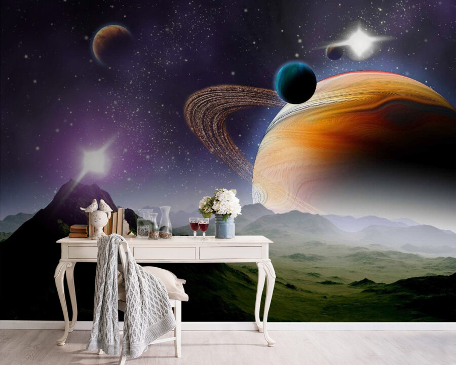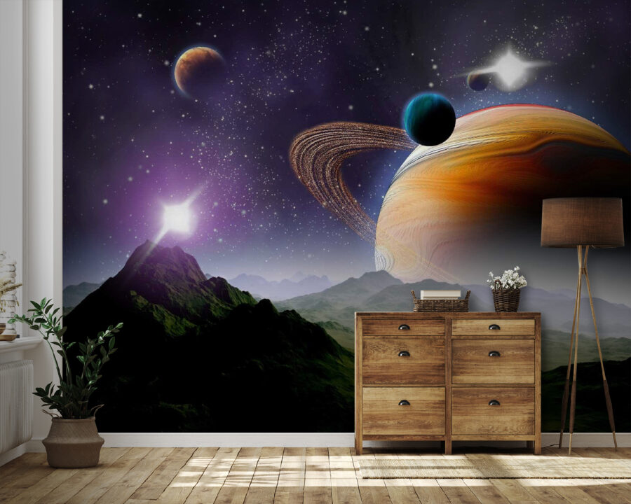Transforme su espacio en una escapada cósmica con este impresionante mural de pared con planetas y estrellas en un vasto universo. Imagínese entrar en una galaxia donde los colores chocan en una danza de tonos vibrantes y suaves remolinos. Este mural no sólo decora las paredes, sino que despierta la imaginación y una pizca de pasión por los viajes. Imagínese acurrucándose con un libro, perdiéndose en una historia mientras el universo le rodea. O tal vez inspire conversaciones profundas sobre la vida, los sueños y lo que hay ahí fuera. Adecuado para cualquier habitación, es perfecto para iniciar una conversación: ¿a quién no le gustaría charlar sobre aventuras interestelares mientras se toma un café? No es sólo un mural, ¡es una puerta al cosmos en tu propia casa!