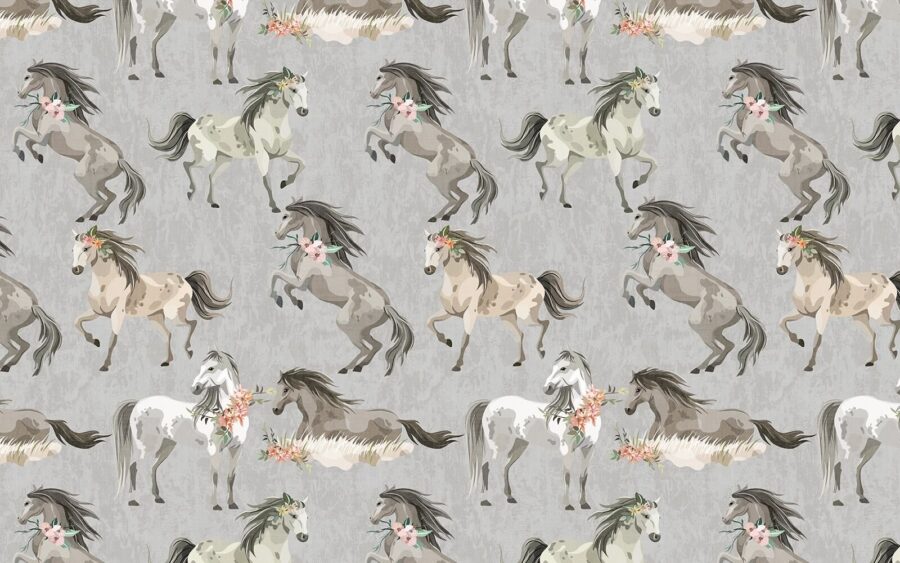 Imagínese entrar en una habitación y ser recibido por estos majestuosos sementales: ¡es como entrar en un sueño caprichoso! El mural “Caballo con flores en el pelo” es un auténtico regalo para la vista. Cada caballo, adornado con delicadas flores, se pasea por la pared, aportando un ambiente divertido y sereno a cualquier espacio.