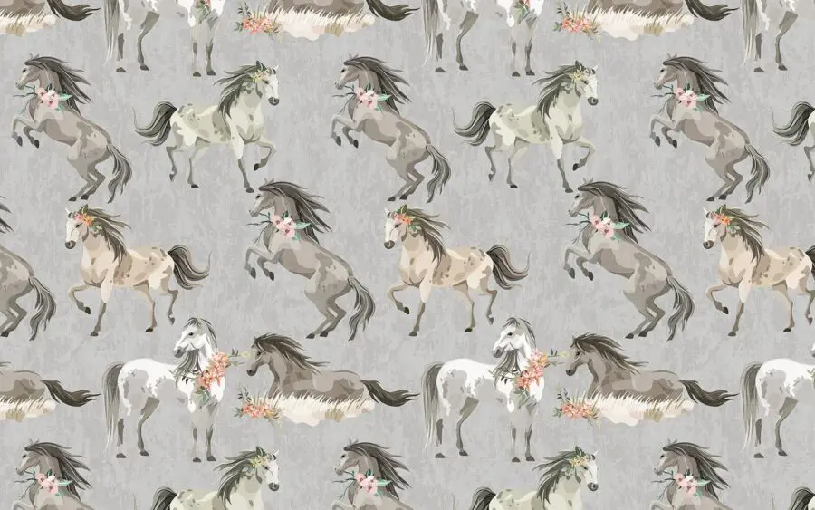 Imagínese entrar en una habitación y ser recibido por estos majestuosos sementales: ¡es como entrar en un sueño caprichoso! El mural “Caballo con flores en el pelo” es un auténtico regalo para la vista. Cada caballo, adornado con delicadas flores, se pasea por la pared, aportando un ambiente divertido y sereno a cualquier espacio.