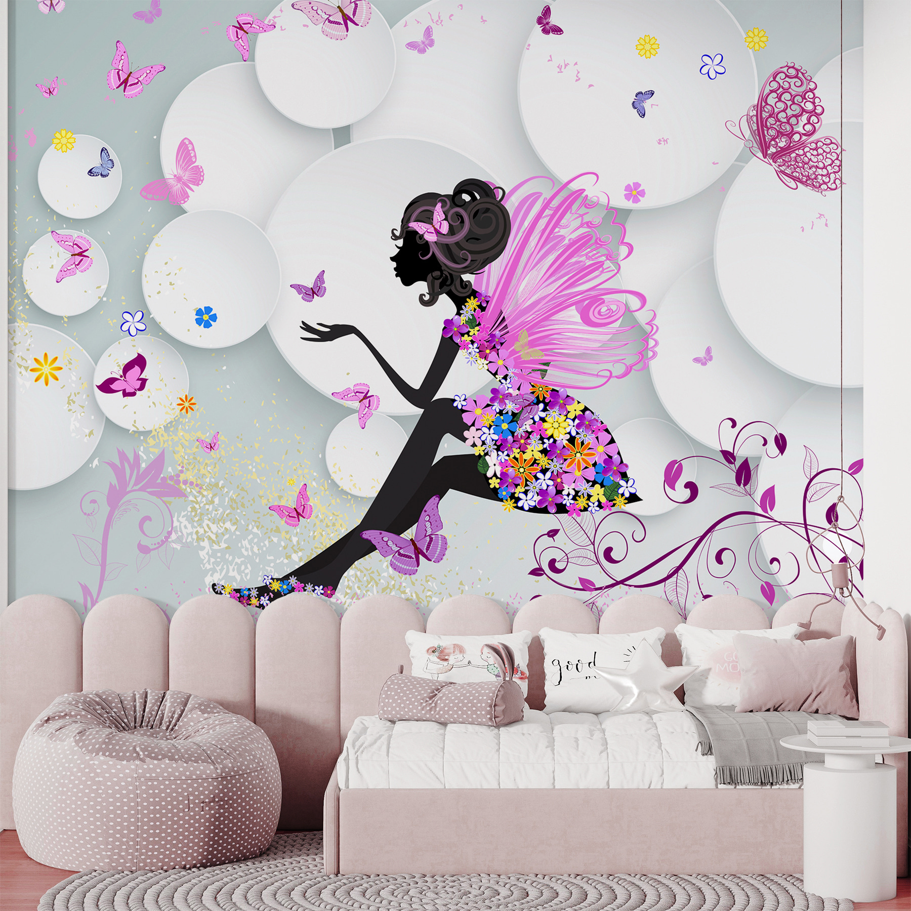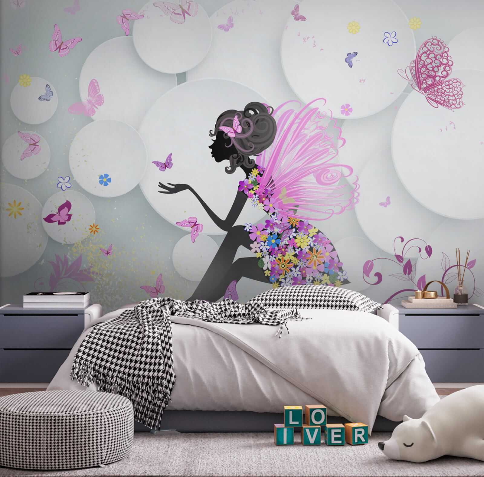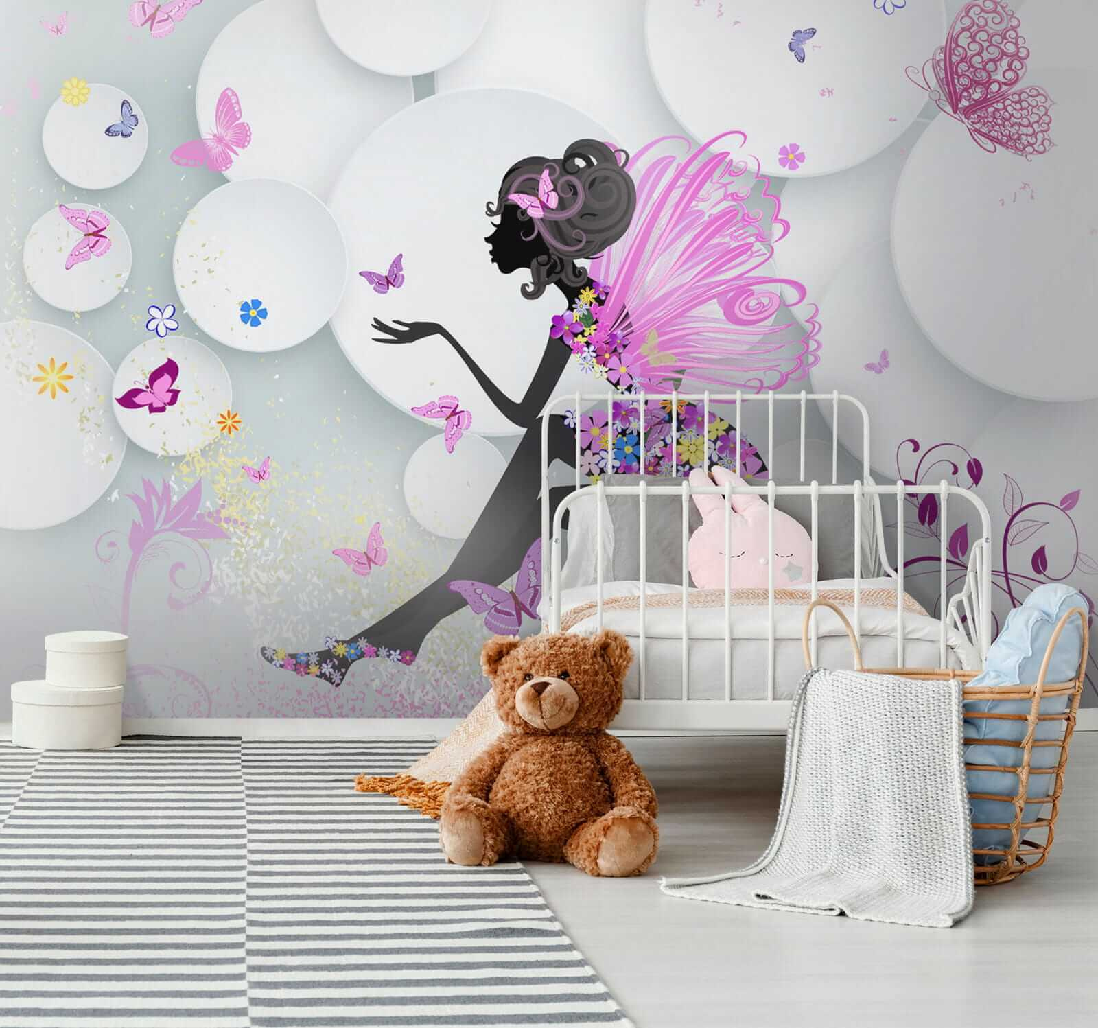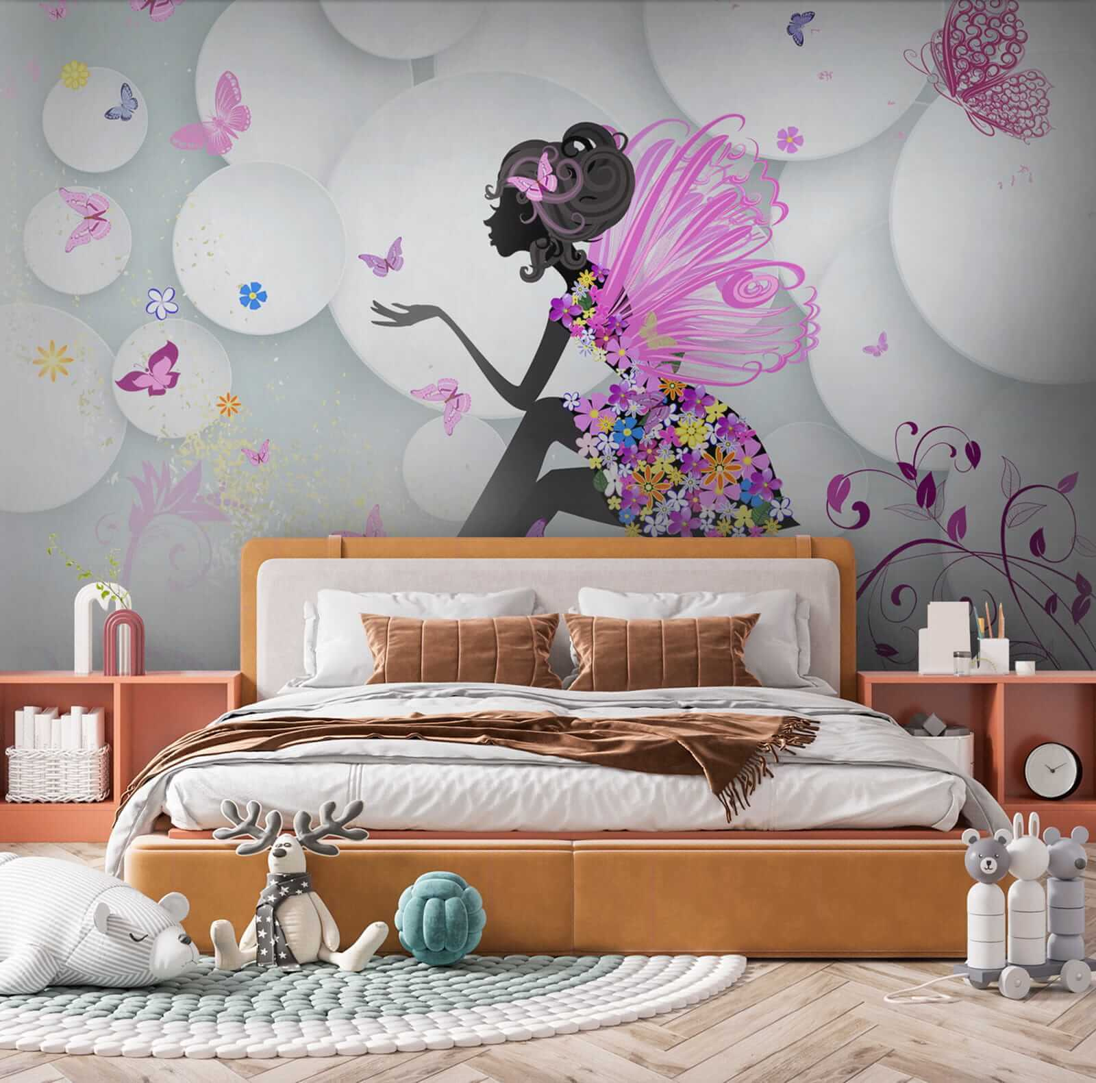 Hola a todos ¿Quieres añadir un toque de fantasía a la habitación de tu hija? Echa un vistazo a este precioso mural de pared, acertadamente llamado “Plato blanco con una flor azul”. Es como un cuento de hadas convertido en arte: vibrantes mariposas revoloteando alrededor de un hada de ensueño. Imagina que tu pequeño ve esto cada mañana, ¡es suficiente para hacer sonreír a cualquiera!