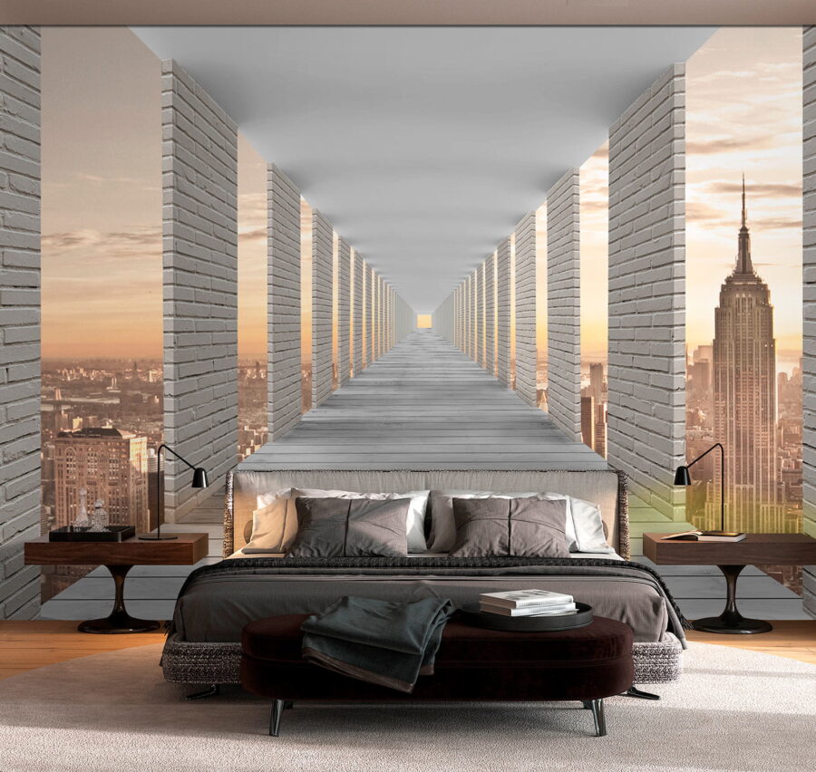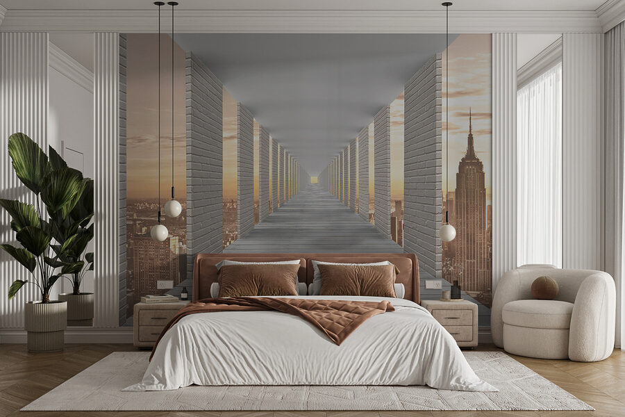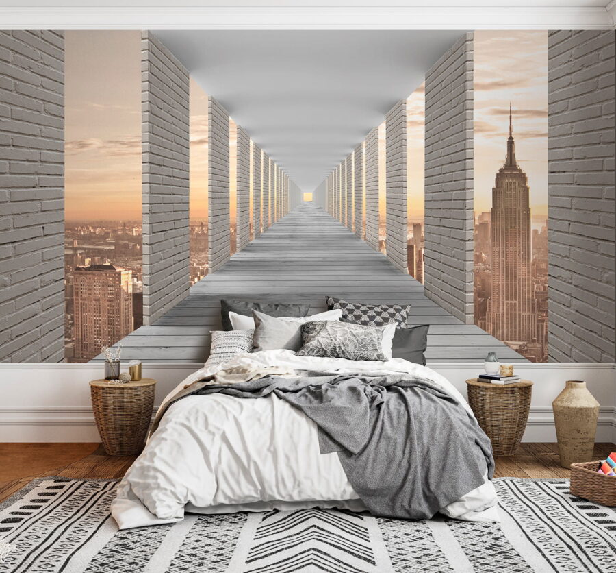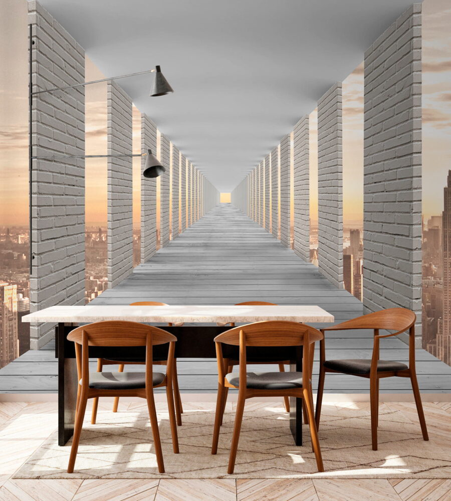 Imagine tener este mural de ensueño en su pared, donde un pasillo interminable conduce a un paisaje urbano mágico. Las líneas frías y nítidas del alto edificio y esas ventanas interminables dan a tu espacio una sensación de profundidad, casi como si tu habitación hubiera crecido y alcanzado un nuevo nivel de sofisticación. Los tonos cálidos de la puesta de sol al otro lado de las “ventanas” aportan un ambiente acogedor a la vez que amplio, perfecto para soñar despierto o fingir que estás en un loft urbano de lujo. Es como si tus paredes descubrieran que pueden escaparse sin dejarte atrás. Transforma por completo una pared anodina en un tema de conversación. El ambiente de este mural es tan… urbano y chic, ¿sabes? ¿Y quién no querría una pizca de eso en su salón u oficina?