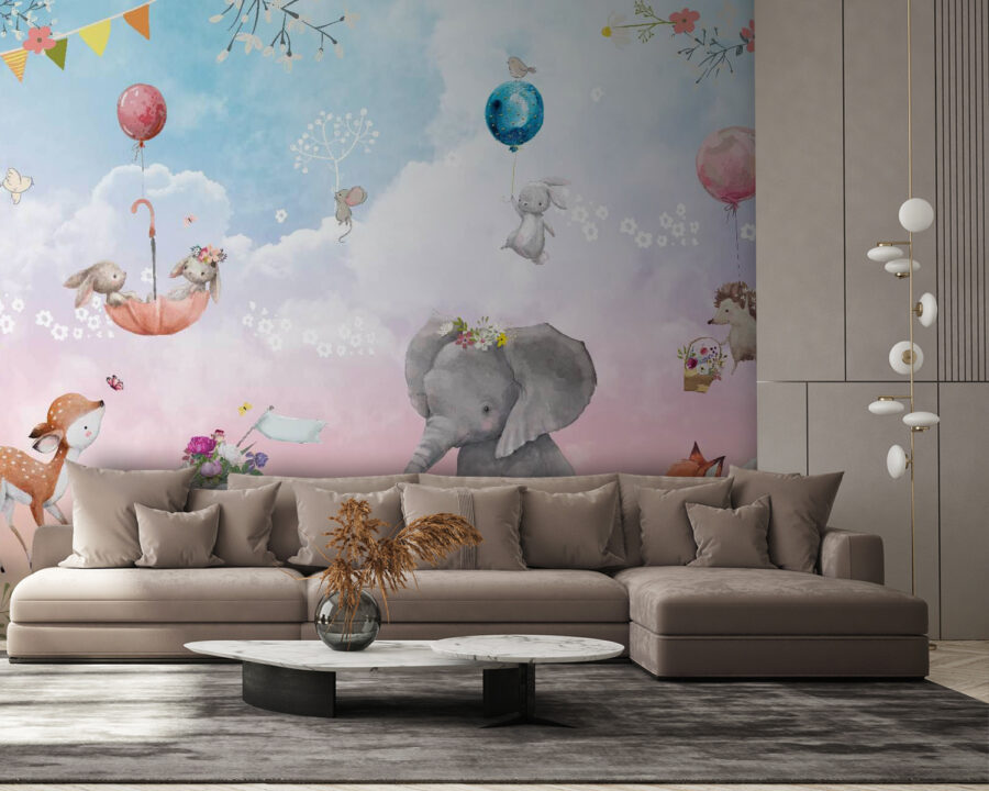 Transforma tu espacio con este encantador mural decorativo con animales caprichosos y alegres globos. Imagina un gentil elefante, adornado con flores, compartiendo un momento con juguetones conejitos y un curioso erizo, todos disfrutando de un cielo pastel de ensueño. ¡Es como una escena sacada de un cuento encantador!