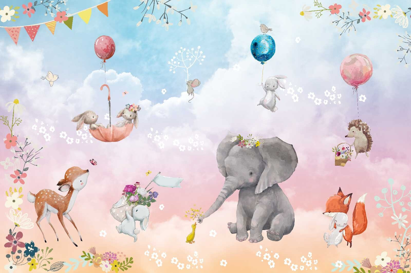 Transforma tu espacio con este encantador mural decorativo con animales caprichosos y alegres globos. Imagina un gentil elefante, adornado con flores, compartiendo un momento con juguetones conejitos y un curioso erizo, todos disfrutando de un cielo pastel de ensueño. ¡Es como una escena sacada de un cuento encantador!