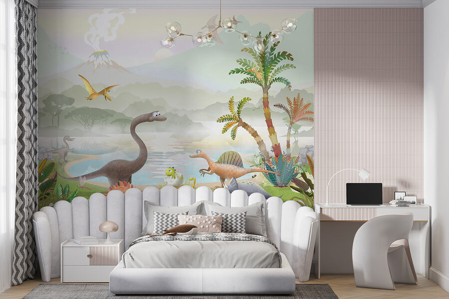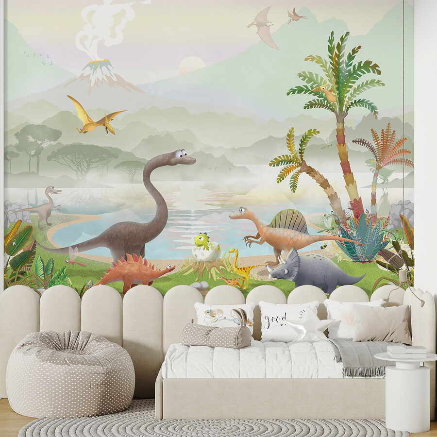 ¿Buscas algo que llene de emoción la habitación de un niño? Echa un vistazo a este adorable mural de pared con un pterodáctilo volando por encima de un mundo de dinosaurios de dibujos animados. Imagínatelo: vibrantes dinosaurios deambulando, exuberantes plantas prehistóricas y un humeante volcán de fondo; ¡es como entrar en una colorida máquina del tiempo! A los niños les encantará señalar a sus dinosaurios favoritos y simular que vuelan junto al pterodáctilo. Es perfecto para despertar la imaginación y añadir un divertido toque de color a cualquier habitación. ¡Serás el padre más guay del barrio!