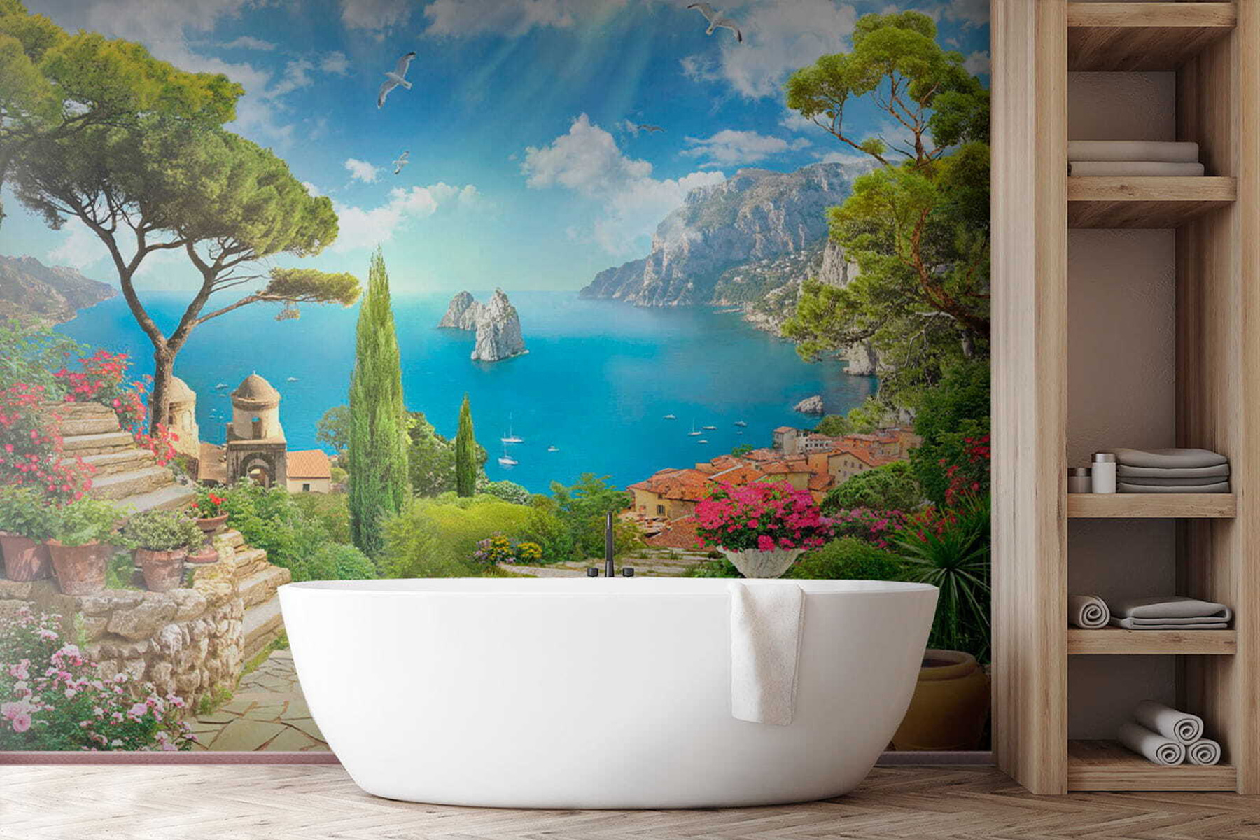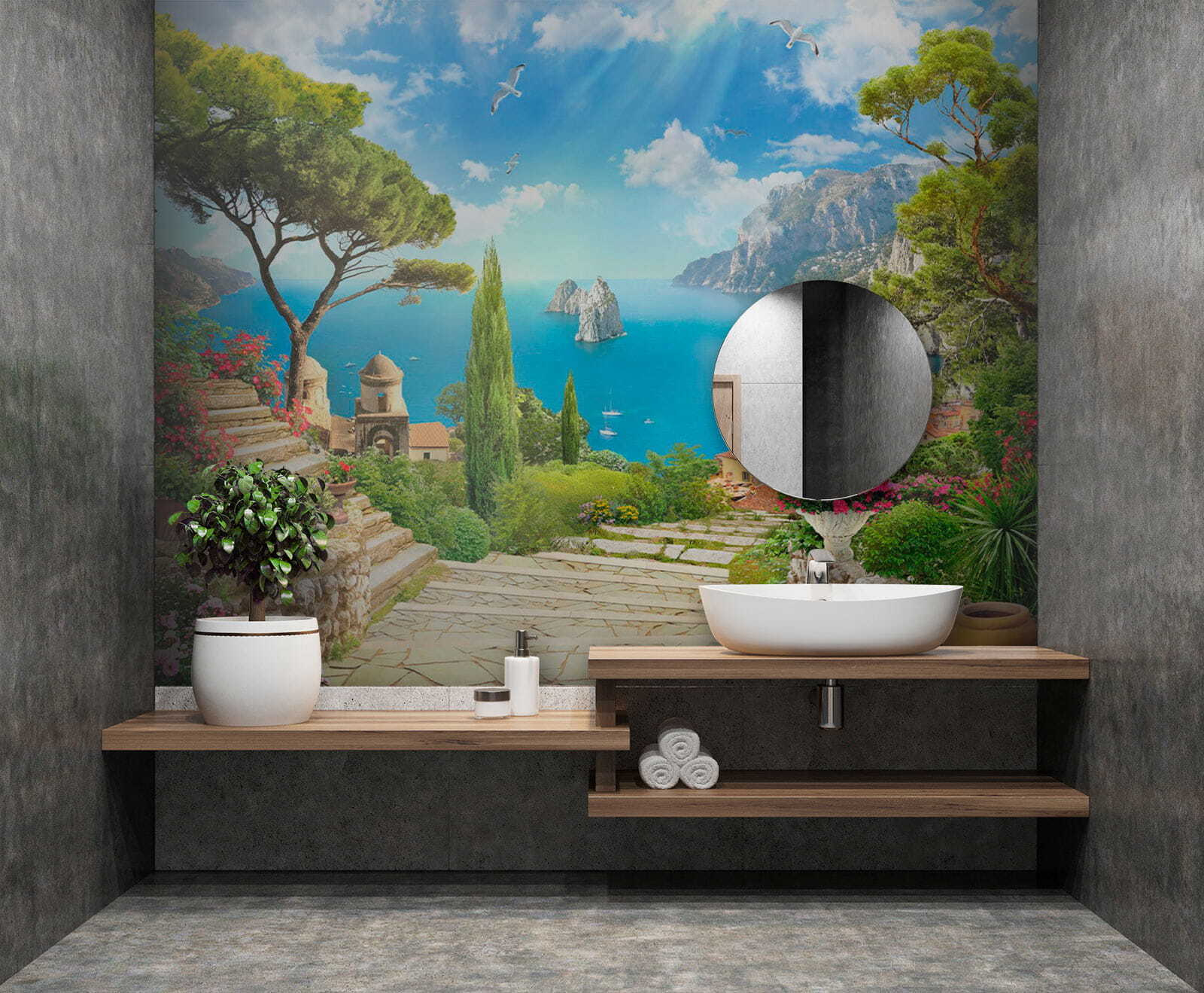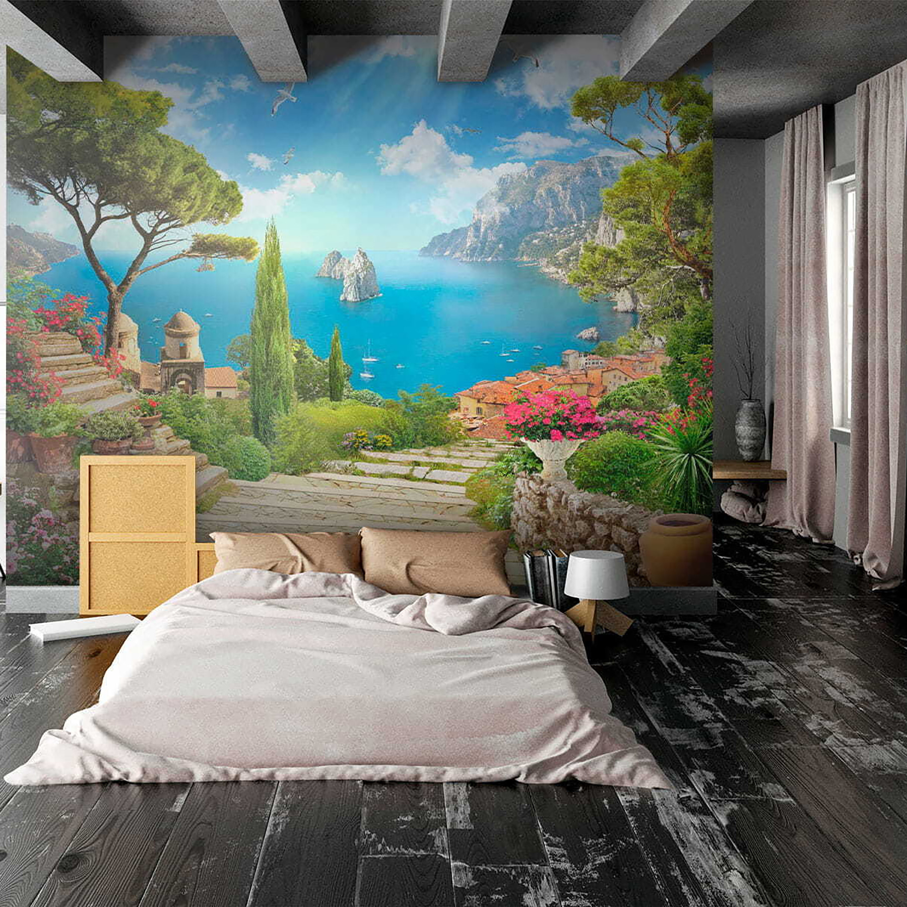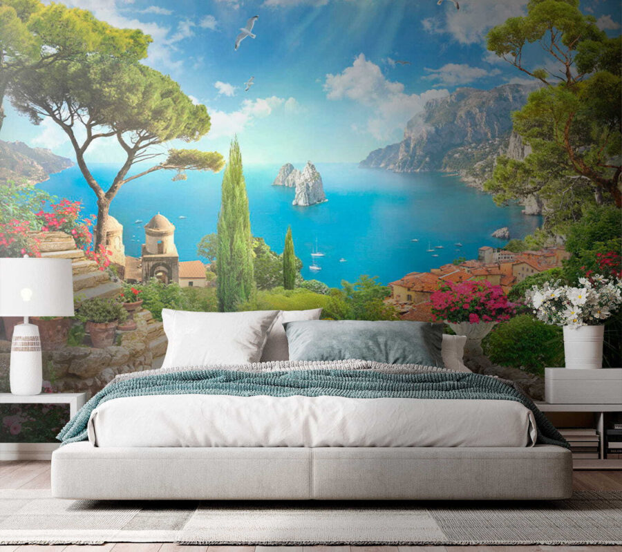 Imagínatelo: entras en el salón de tu casa, pero en su lugar te recibe una impresionante vista del mar. Con los murales “Pájaro volando en el cielo”, tus paredes se iluminarán. Es como añadir una ventana con vistas directas al Mediterráneo, con un toque de fantasía. Piense en una vegetación vibrante, encantadores caminos de piedra y pájaros que vuelan alto.