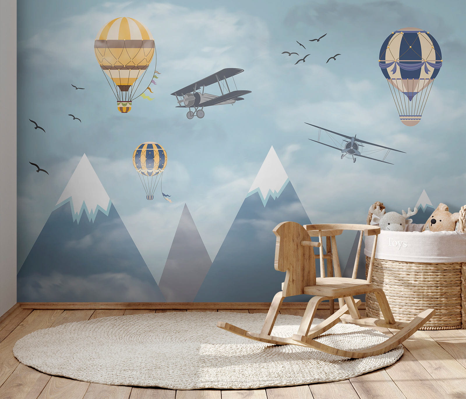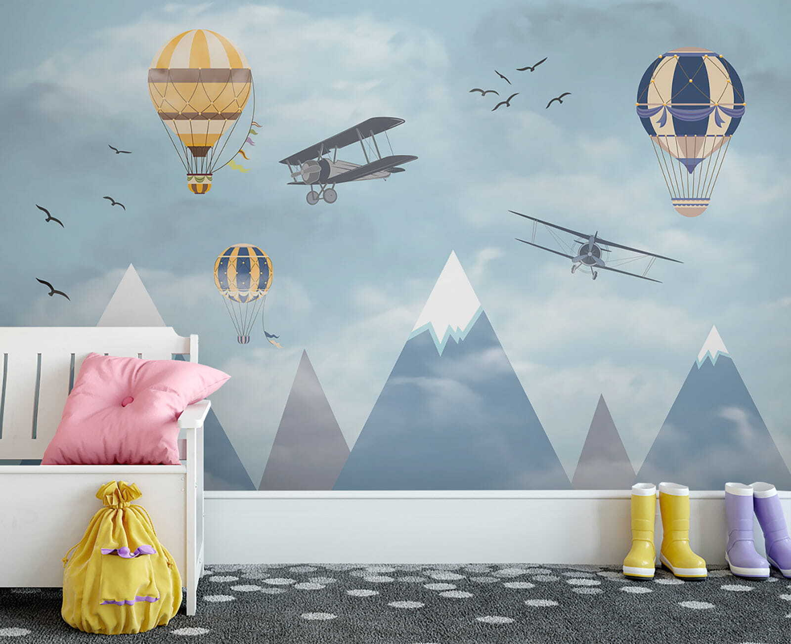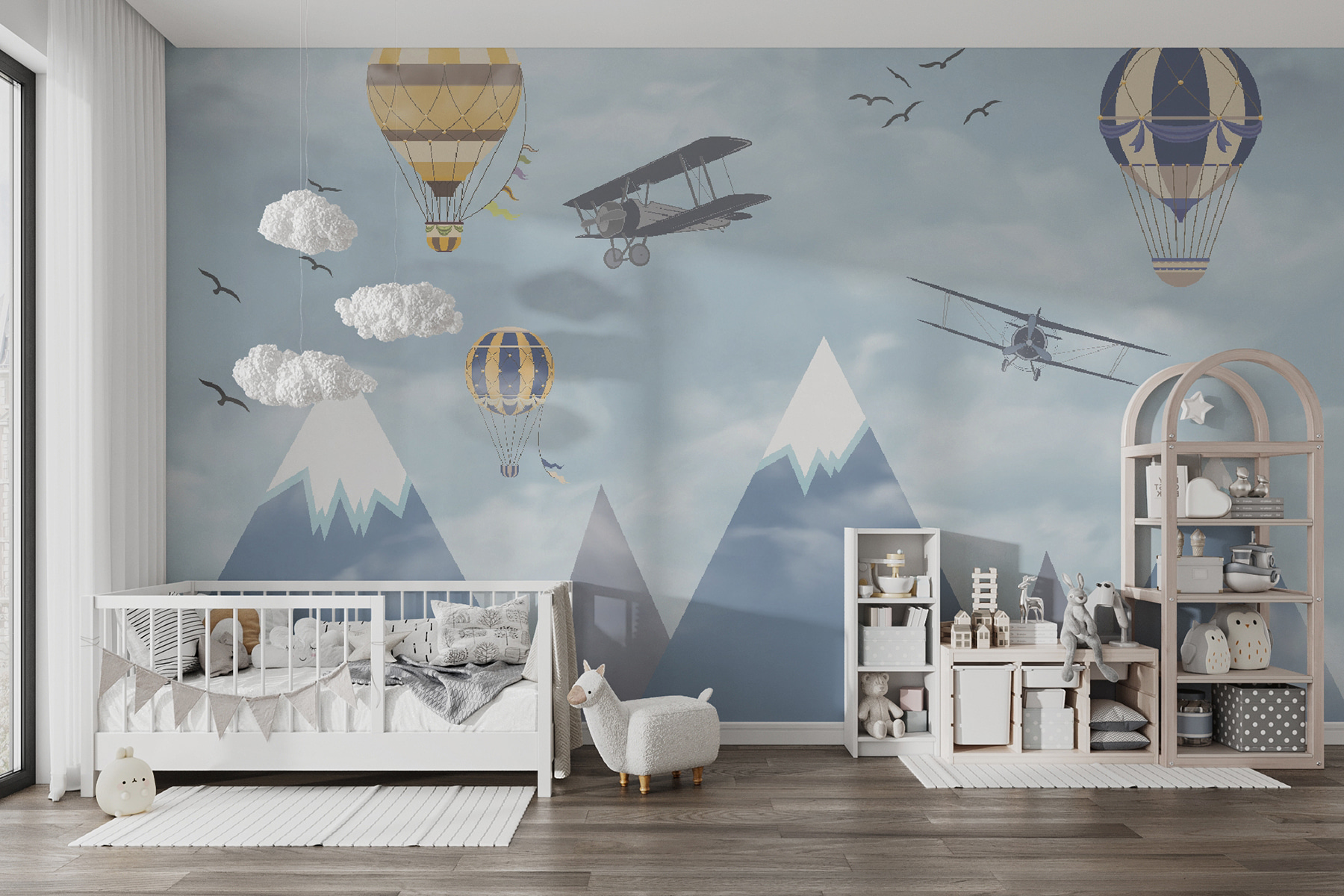 Imagínese que se despierta en un cielo lleno de globos aerostáticos que flotan entre las nubes, junto a aventureros aviones que pasan y pájaros que vuelan alto: ¡es pura magia! El mural “Globo aerostático en el cielo” aporta una sensación de asombro y aventura a la habitación. Perfecto para despertar la creatividad y los sueños en los espacios infantiles, es como darles un lienzo para que hagan volar su imaginación. Los azules pastel y las suaves nubes son tan relajantes que hacen que el espacio parezca ligero y aireado. No es sólo decoración, es un viaje a los cielos sin salir de la habitación. Los padres también pueden sentir una punzada de nostalgia, recordando sueños de lugares lejanos y viajes atrevidos. ¿Quién no querría un poco de eso en su casa? Además, ¿esas montañas nevadas de fondo? Sencillamente encantadoras. Este mural es básicamente una ensoñación en forma de arte mural: infinitamente encantador y maravillosamente sereno. A los niños les encantará, y también al niño que llevas dentro.
