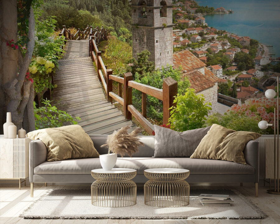 Imagina entrar en un refugio de ensueño cada vez que miras tu pared. Este mural «Escalera que conduce a una ciudad» susurra historias de paseos soleados por jardines vibrantes, con flores que piden ser admiradas. El suave camino de madera te lleva a través de un encantador pueblo, donde las calles empedradas y los coloridos tejados despiertan suavemente tu imaginación. Quizás puedas oír las risas de los niños o el sonido lejano de las olas rompiendo en la orilla. Es un pedazo de paraíso en tu propia casa. Transforma tu espacio con este mural y déjate llevar, aunque solo sea por un momento: es el tema de conversación perfecto para esos domingos tranquilos con amigos. Ideal para todos los amantes de la naturaleza y los soñadores, esta obra aporta calidez y vida a cualquier estancia.