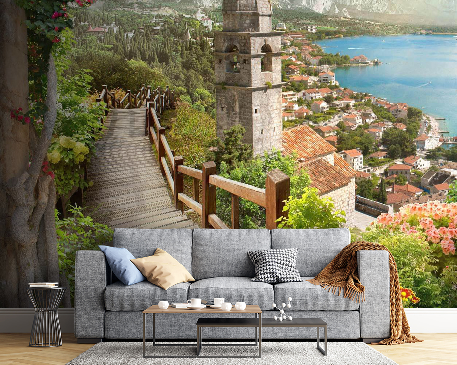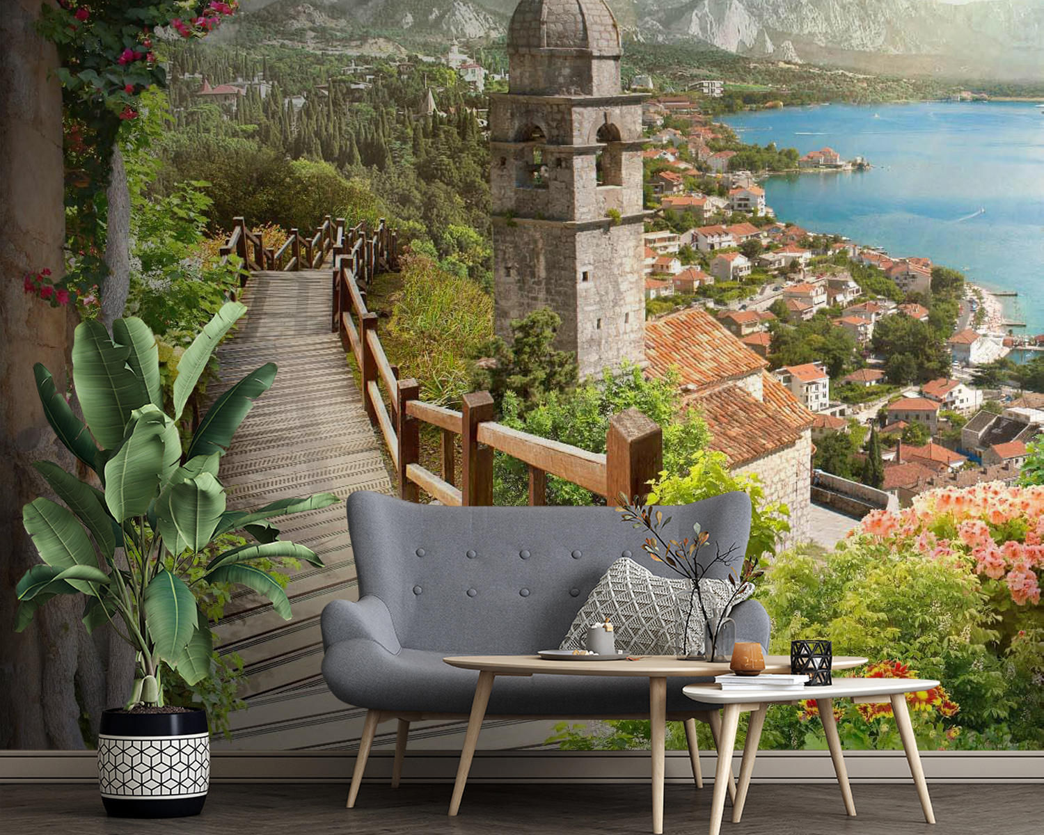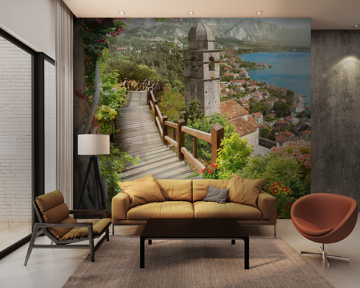 Imagina entrar en un refugio de ensueño cada vez que miras tu pared. Este mural «Escalera que conduce a una ciudad» susurra historias de paseos soleados por jardines vibrantes, con flores que piden ser admiradas. El suave camino de madera te lleva a través de un encantador pueblo, donde las calles empedradas y los coloridos tejados despiertan suavemente tu imaginación. Quizás puedas oír las risas de los niños o el sonido lejano de las olas rompiendo en la orilla. Es un pedazo de paraíso en tu propia casa. Transforma tu espacio con este mural y déjate llevar, aunque solo sea por un momento: es el tema de conversación perfecto para esos domingos tranquilos con amigos. Ideal para todos los amantes de la naturaleza y los soñadores, esta obra aporta calidez y vida a cualquier estancia.
