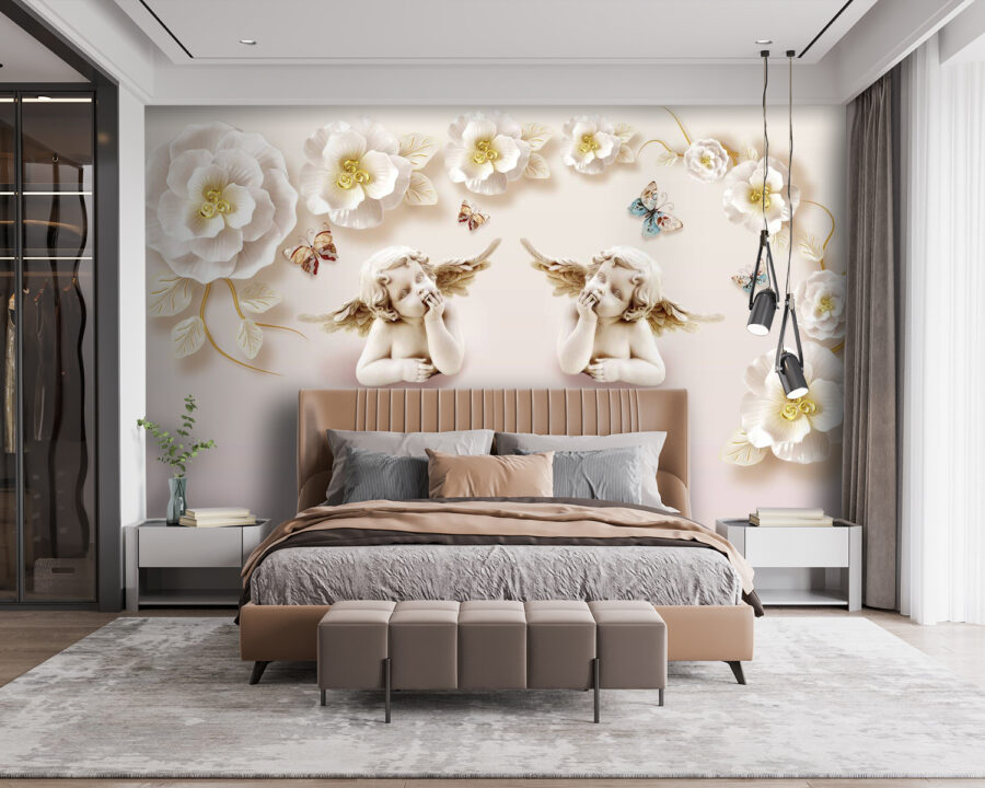 Imagínatelo en la pared: un par de simpáticos querubines con alas, rodeados de flores de ensueño de gran tamaño y suaves mariposas revoloteando. Es como entrar en un jardín de cuento de hadas cada vez que entras en la habitación. Este mural no es sólo decoración, es todo un estado de ánimo. Imagínese que llega a casa después de un largo día y esta serena escena le da la bienvenida, levantándole el ánimo al instante. Ideal para cualquiera a quien le guste un toque de fantasía con una pizca de elegancia. Además, es un tema de conversación fabuloso: los invitados no dejarán de elogiar tu gusto artístico. Aquí es donde la arquitectura se encuentra con el encanto de los cuentos de hadas, perfecto para aquellos que anhelan un poco de encanto en su vida cotidiana.