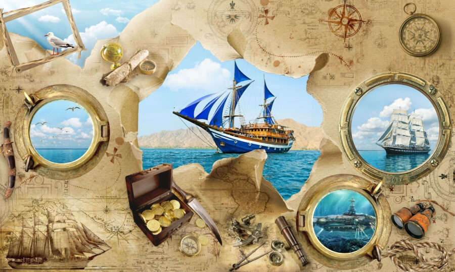 ¡Hola, amigo! Sumérgete en el mundo de la aventura con este mural de pared “Aventuras de navegación en un mapa del tesoro”: ¡es como abrir una ventana mágica a alta mar en tu habitación! Imagínese a su pequeño adentrándose en una emocionante historia de piratas cada vez que entre. ¿Ese barco con sus majestuosas velas azules, el mapa del tesoro y todos esos detalles náuticos? Simplemente perfecto.
