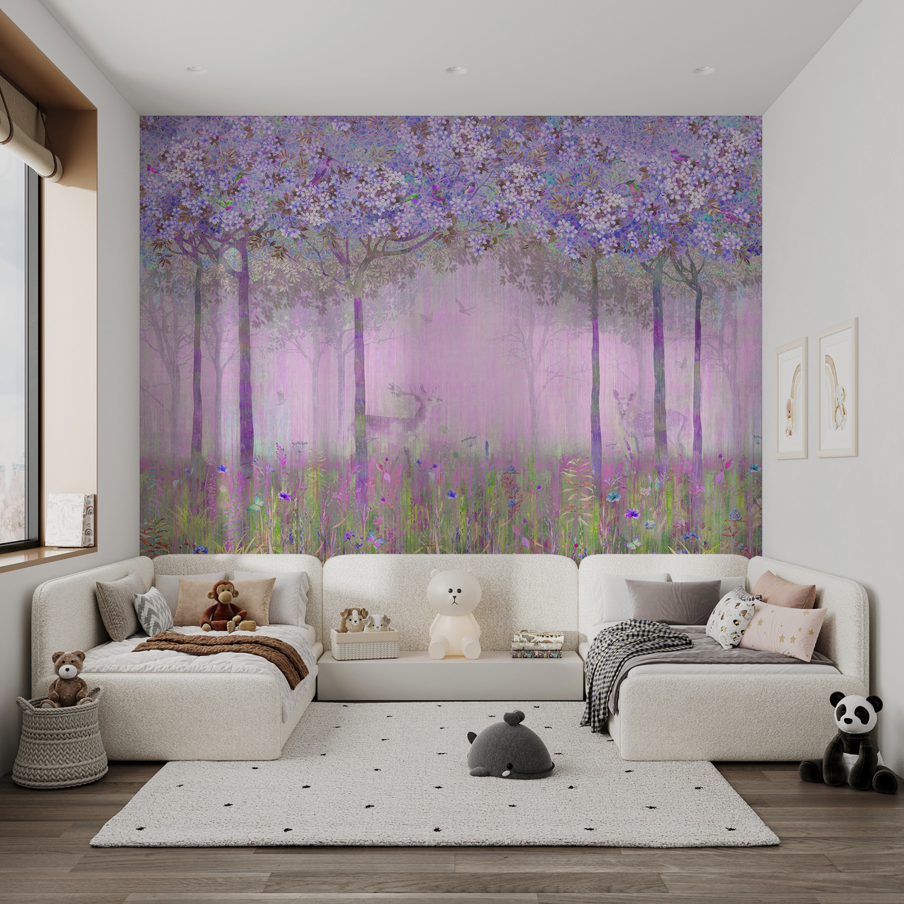 Si lo que busca es añadir un toque de magia y fantasía a una habitación, esta “Pintura mural de flores y hierba” es un auténtico sueño. Imagínese entrar en un bosque de cuento de hadas cada vez que entre en la habitación. Este mural, inundado de suaves lavandas y delicados verdes, parece una serena mañana de primavera. Casi se puede oír el susurro de las hojas y ver a los ciervos asomarse entre la bruma.