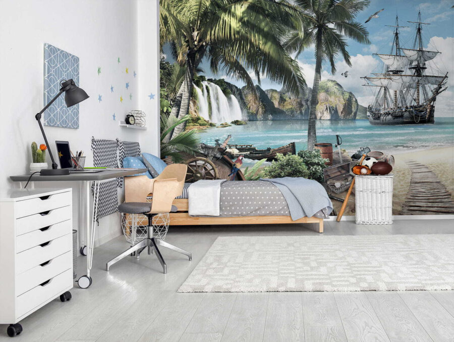 Transforma cualquier espacio en un paraíso bañado por el sol con los “Murales de pared Barco pirata anclado en el paraíso tropical”. Imagina entrar en un mundo donde la brisa marina roza suavemente tu cara y vibrantes palmeras se mecen por encima. Este mural da vida a una escena impresionante: un barco pirata aventurero atracado cerca de aguas cristalinas, rodeado de tesoros y de una naturaleza exuberante. Los niños se sentirán parte de una aventura de capa y espada, explorando tesoros ocultos e islas secretas. Es algo más que decoración; es una chispa para la creatividad, historias inspiradoras e interminables ensoñaciones. ¿Quién no querría salir a navegar cada vez que echa un vistazo a su pared? Perfecto para cuartos de juegos o dormitorios, este mural crea una encantadora escapada que seguro hará sonreír a todo el mundo. ¡Deja que la imaginación se haga a la mar!