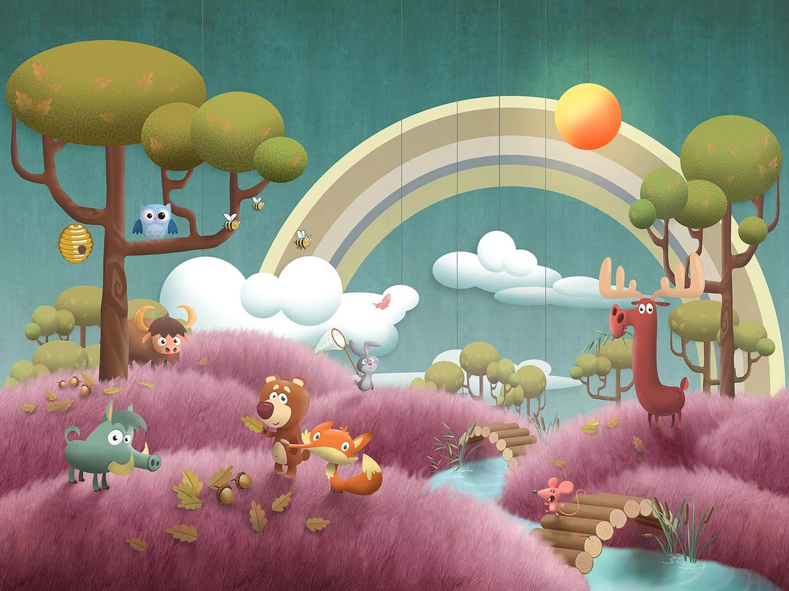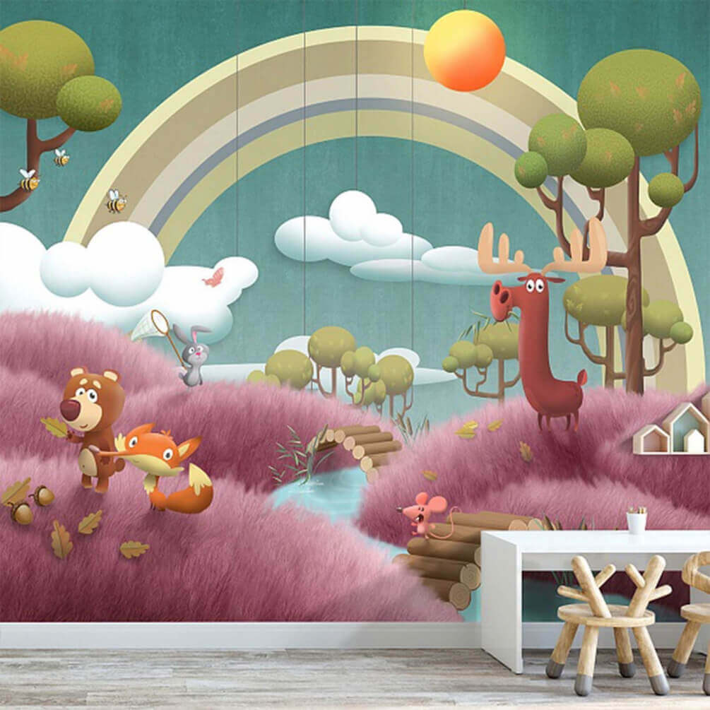 Dive into a whimsical world with this delightful wall mural featuring a cartoon scene bursting with vibrant animals by a serene river. Imagine a cozy corner in your home where a curious moose and a cheeky fox engage in a little mischief among the soft, fluffy trees. The playful vibe invites smiles and daydreams alike, perfect for kids or the young at heart. With a gentle rainbow stretching across the scene, it’s like bringing a slice of happy outdoor adventures indoors. Transform any space into a cheerful escape, and who knows—maybe these furry pals will inspire some new stories!