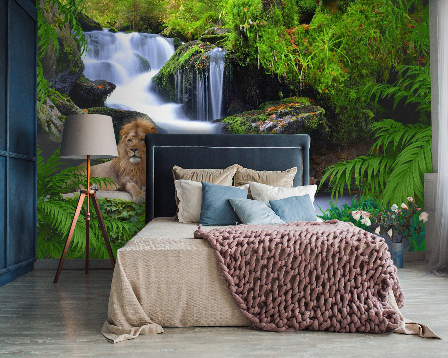 Este mural lo tiene todo: verdes helechos, exuberante vegetación y una majestuosa cascada que cae sobre musgosas rocas. Ah, y ¿has visto al regio león descansando como si fuera su trono personal en la selva? Imagínese esta belleza en su salón… es como llevar un trozo de paraíso salvaje al interior. Perfecto para cualquiera que sueñe con estar rodeado de naturaleza (sin los insectos ni la humedad). Los colores vibrantes le dan vida, casi como si pudieras oír el chapoteo del agua y sentir el aire fresco del bosque. Es el sueño de cualquier amante de los animales, un paraíso para los entusiastas de la naturaleza y un toque único si estás cansado de las aburridas paredes lisas. Desde los niños a los adultos, todo el mundo se detendrá y se quedará mirando, probablemente deseando haber redecorado antes. Esto sí que es transformar un espacio.