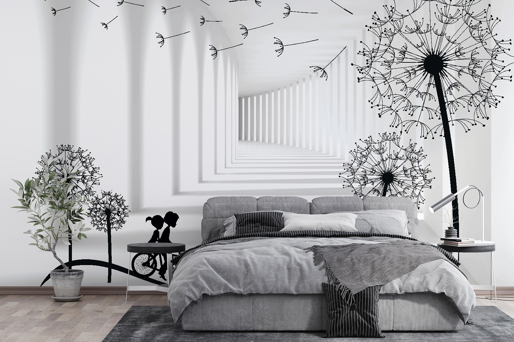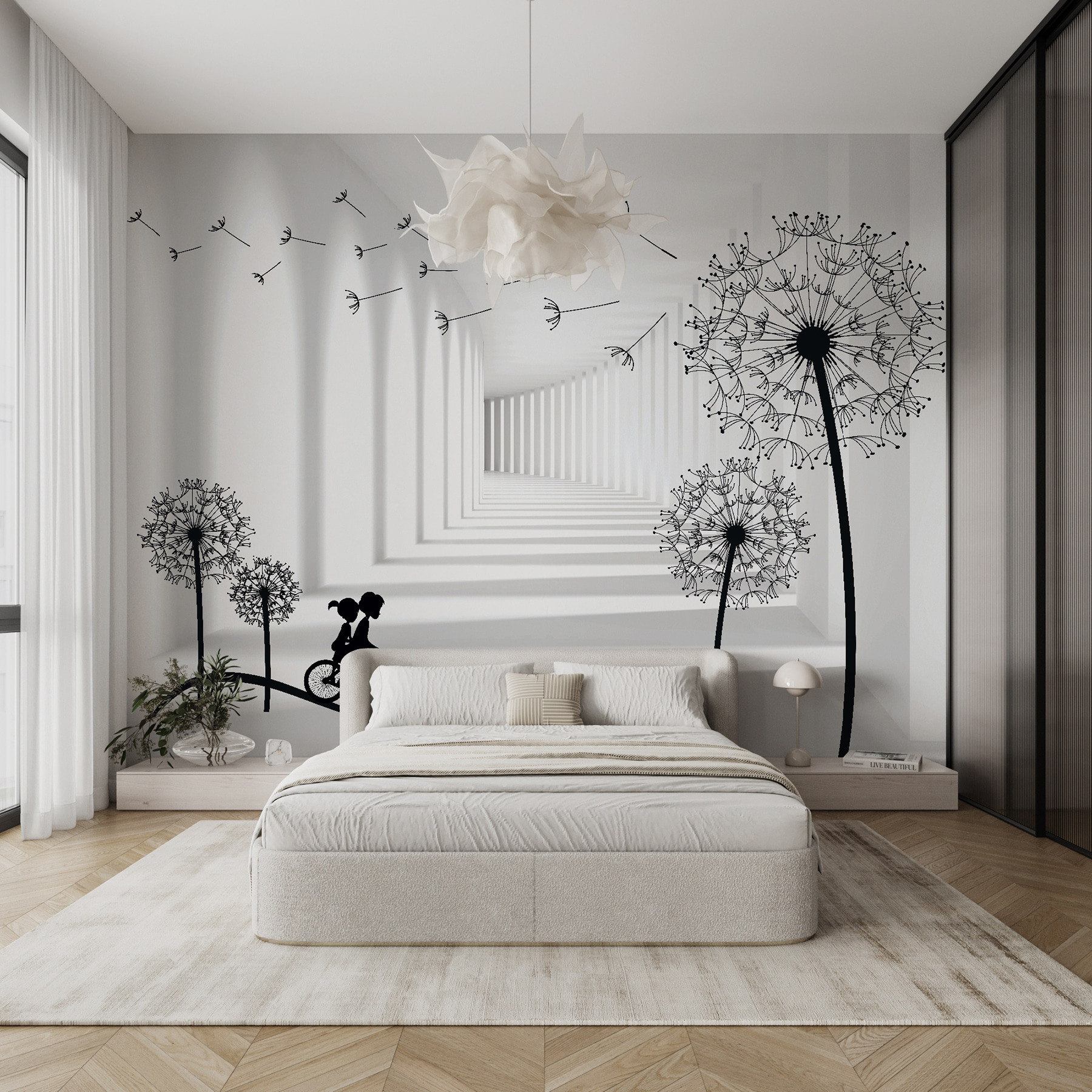 Transforme su espacio con este caprichoso mural de pared en el que aparecen un niño y una niña montando en bicicleta por un paisaje de ensueño lleno de dientes de león. Las juguetonas siluetas invitan a una sensación de libertad y aventura, despertando recuerdos de despreocupados días de infancia y paseos a la luz del sol. Imagina despertarte cada mañana, gratamente sorprendido por esta alegre escena que añade un toque de encanto a tus paredes. Es como llevar un trozo de nostalgia a tu hogar. Perfecto para salones, salas de juegos o incluso para ese pequeño rincón de lectura, este mural no es sólo decoración, ¡es un viaje encantador a la espera de suceder!