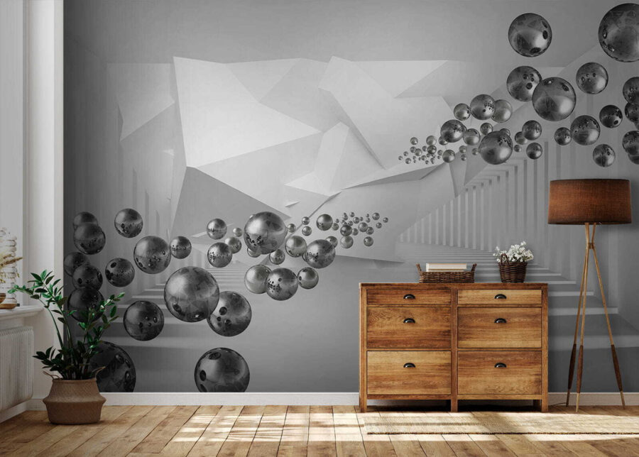 Adéntrese en un patio de recreo visual con el mural “Esferas flotantes en un pasillo geométrico”, donde la creatividad es la protagonista. Imagínese caminando por un reino de ensueño de orbes caprichosos y ángulos agudos, creando una deliciosa danza de profundidad e intriga. Es como estar en un laberinto en el que cada giro trae una nueva sorpresa. El ambiente elegante y moderno es perfecto para cualquier espacio, ya sea una acogedora oficina en casa o un animado salón. Los amigos se asomarán curiosos, preguntando qué magia está ocurriendo en tus paredes. No es sólo decoración, ¡es una experiencia!