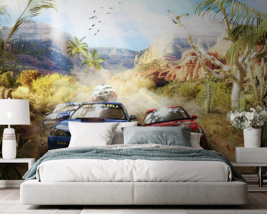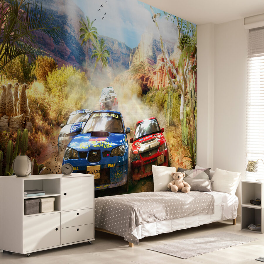 Imagínese entrar en la habitación de su hijo y ser transportado a una aventura en el desierto, con coches de rally levantando polvo mientras atraviesan cañones escarpados y cactus saguaro. Este mural no es sólo un toque de color, es como abrir una ventana a una emocionante carrera. Los niños sentirán el subidón de la emoción al imaginarse al volante, sorteando esos giros y curvas. No se trata sólo de coches, sino de la salvaje libertad del desierto, la camaradería de una carrera y el puro placer de la velocidad. Perfecto para pequeños aventureros o entusiastas de las carreras, ¡está destinado a despertar la imaginación e incluso a provocar algunos ruidos de “vroom vroom”! Y además, no es sólo para niños: los adultos también pueden soñar despiertos con los sinuosos caminos del desierto.