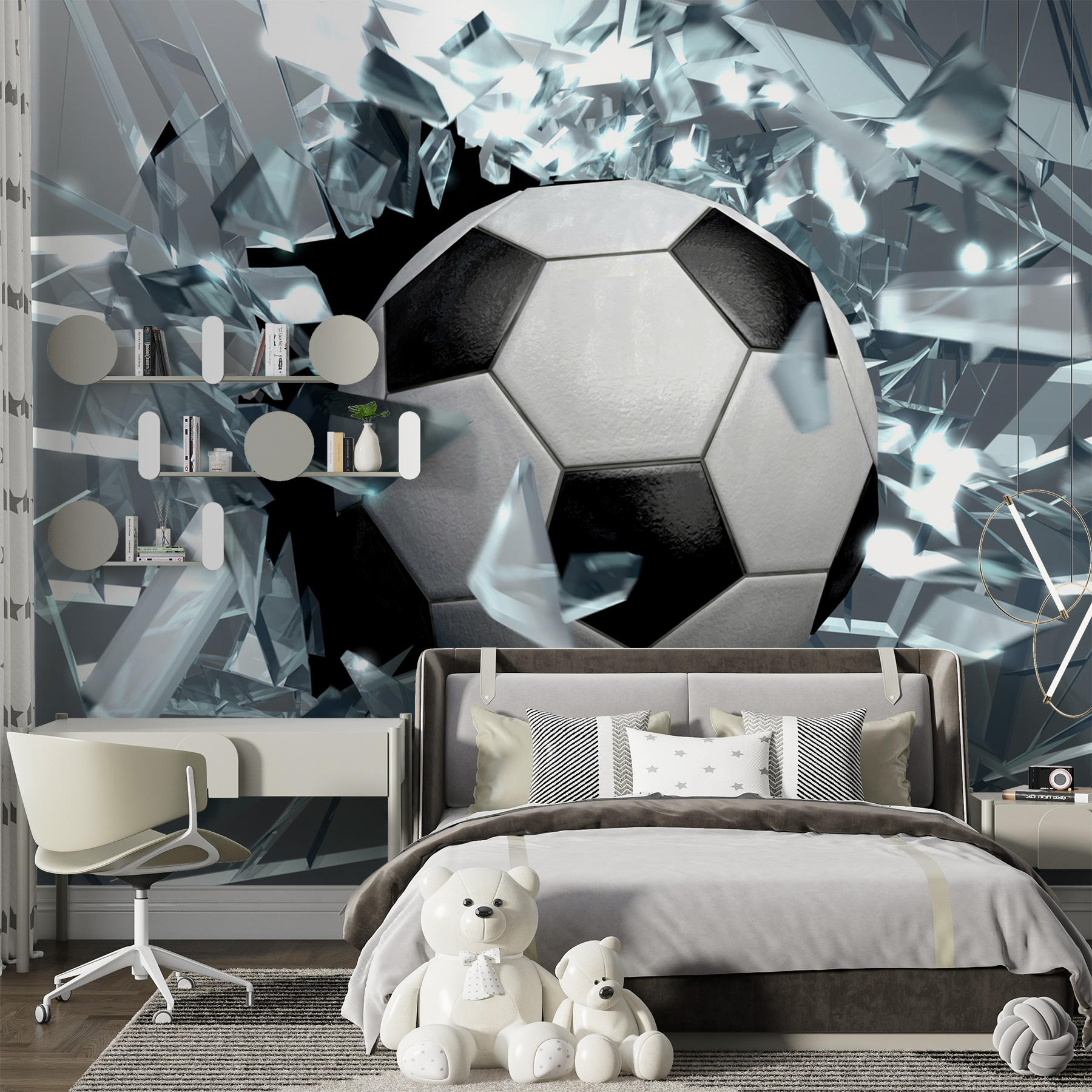 Transformando una habitación en una vibrante aventura, este mural lleva la emocionante energía del fútbol directamente a su pared. Imagínese un potente balón de fútbol que atraviesa una barrera imaginaria, con fragmentos de cristal que desprenden un ambiente animado. Es como si tu espacio acabara de marcar el gol definitivo, por lo que es perfecto para los niños que sueñan con convertirse en superestrellas en el campo. Imagínese: los amigos se acercan, los ojos se abren y las preguntas vuelan. ¿Qué niño no se sentiría como un campeón con esta dinámica escena? Es algo más que decoración: ¡es inspiración, emoción y mucha diversión!