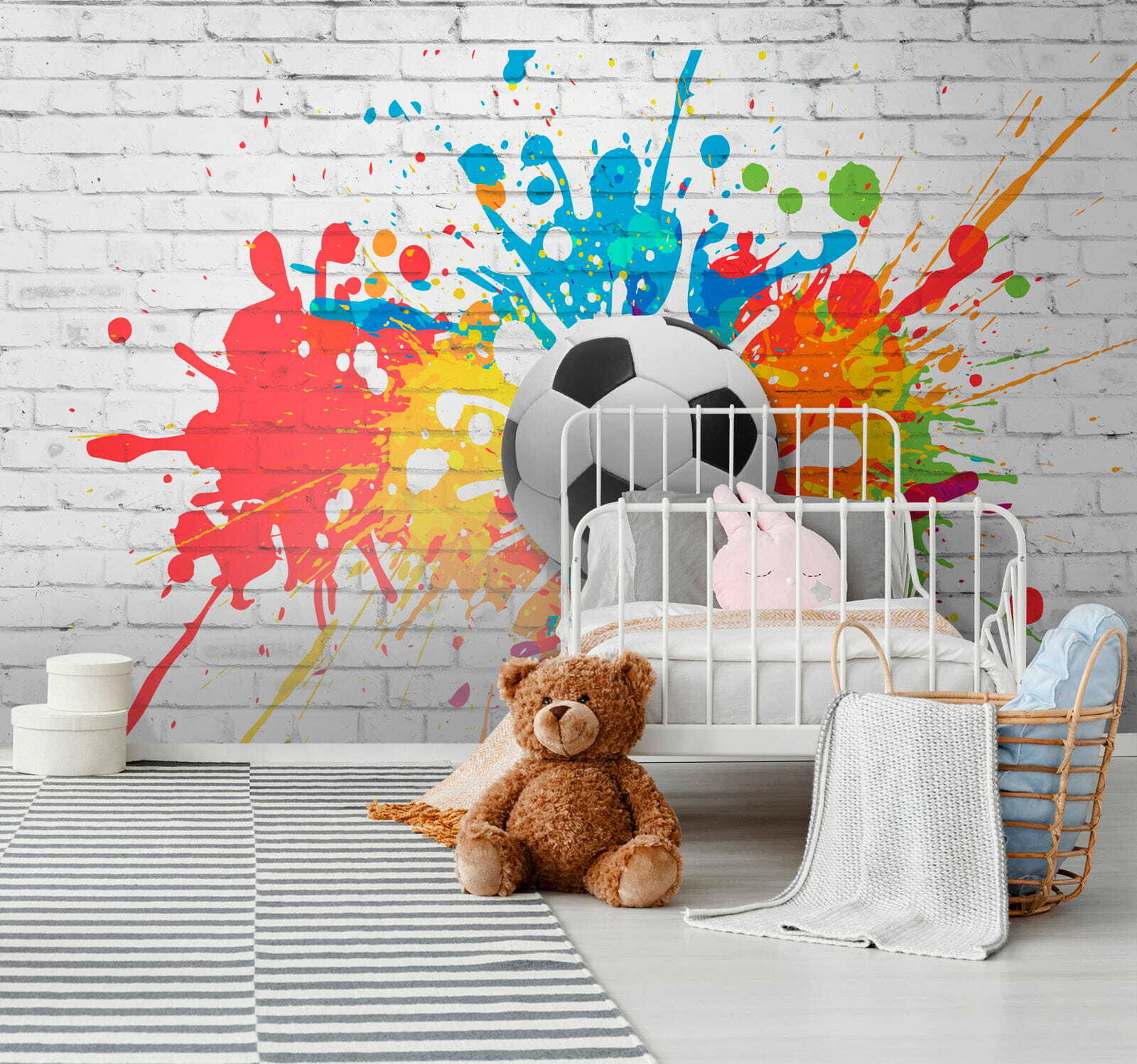 Imagínatelo: una explosión de colores vivos contra una pared de ladrillos blancos y, justo en medio, un balón de fútbol clásico en blanco y negro. Es como si alguien hubiera cogido el gol más emocionante del mundo y lo hubiera congelado en tu salón. Perfecto para la habitación de un niño, este mural tiene toda la energía de la multitud de un estadio en una sola pared. Los atrevidos tonos resaltan sobre el monocromo del balón, creando un contraste a la vez divertido e impactante. Es magia 3D que da vida al juego. Imagine la emoción en la cara de su hijo cuando entre y vea esto: un telón de fondo diario para sus sueños de marcar el gol de la victoria. Ya sea jugando o simplemente pasando el rato, este mural crea el ambiente perfecto.