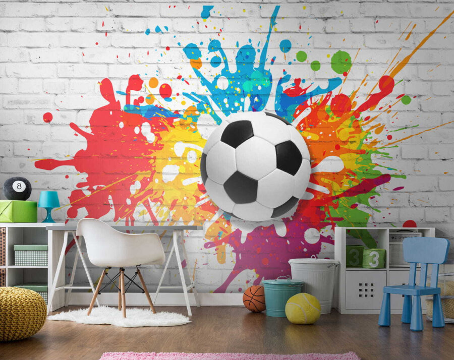 Imagínatelo: una explosión de colores vivos contra una pared de ladrillos blancos y, justo en medio, un balón de fútbol clásico en blanco y negro. Es como si alguien hubiera cogido el gol más emocionante del mundo y lo hubiera congelado en tu salón. Perfecto para la habitación de un niño, este mural tiene toda la energía de la multitud de un estadio en una sola pared. Los atrevidos tonos resaltan sobre el monocromo del balón, creando un contraste a la vez divertido e impactante. Es magia 3D que da vida al juego. Imagine la emoción en la cara de su hijo cuando entre y vea esto: un telón de fondo diario para sus sueños de marcar el gol de la victoria. Ya sea jugando o simplemente pasando el rato, este mural crea el ambiente perfecto.