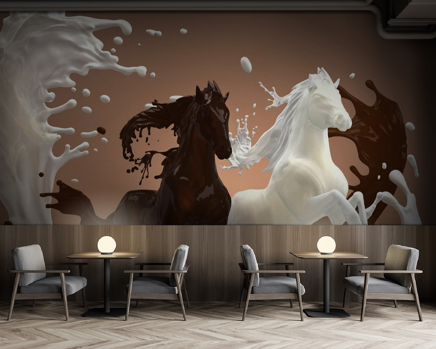 Sumérgete en un toque de fantasía con el «Mural de caballo con leche salpicando a su alrededor». Imagina dos impresionantes caballos, uno oscuro y otro claro, galopando a través de un abismo cremoso como si estuvieran en su propia carrera épica. No es solo un mural, es toda una declaración.