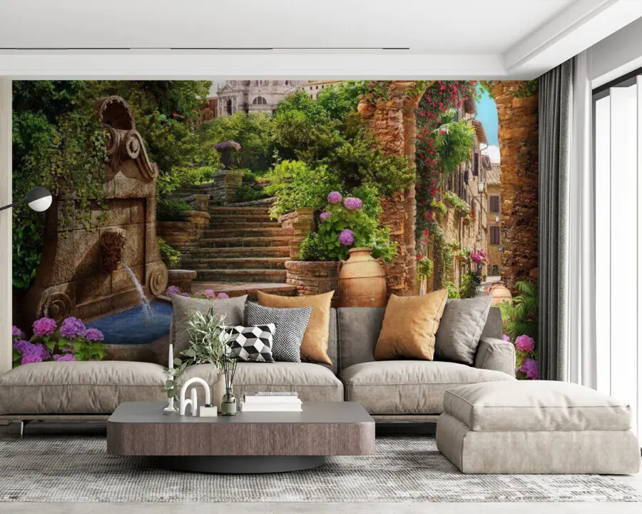 Transforme cualquier espacio en una escapada de ensueño con este encantador mural de pared con un sereno camino de piedra, una fuente burbujeante y flores vibrantes. Imagínese entrar en una acogedora escapada europea desde su salón o dormitorio. Los relajantes sonidos del agua le harán casi oír suaves ondas, mientras que las coloridas flores añaden un toque de alegría al paisaje. Es como encontrar ese rincón escondido de un pueblo pintoresco, esperando para inspirar su próxima aventura. Perfecto para un toque de encanto, invita a soñar despierto con cada mirada. ¿Quién no querría tomarse un café junto a esa fuente? Es calidez y fantasía, todo en una pieza encantadora.