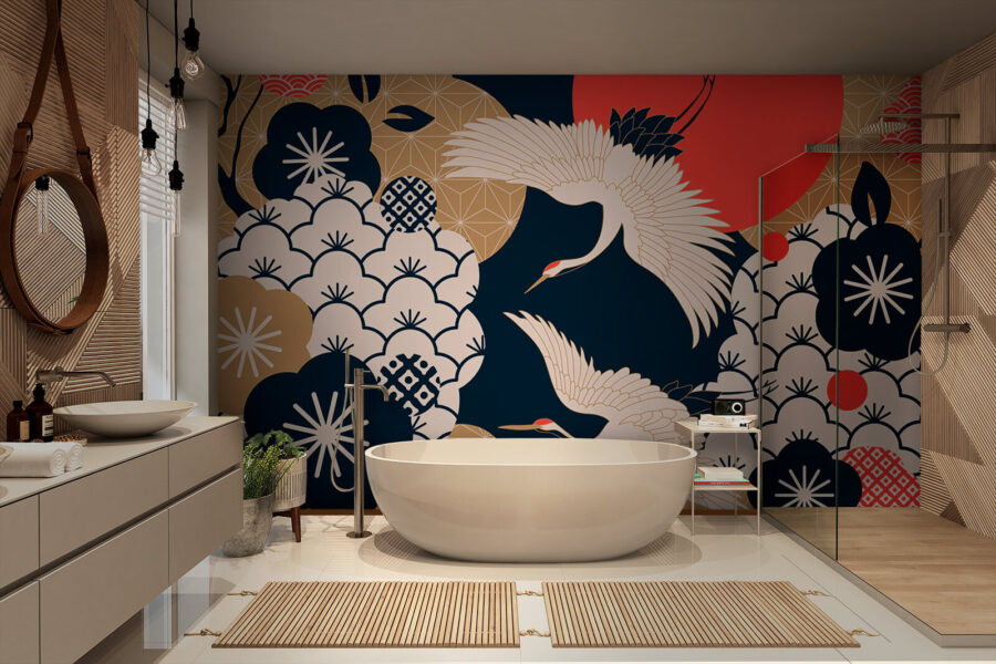1 valoración en Fotomurales Las grullas se elevan sobre las flores decorativas